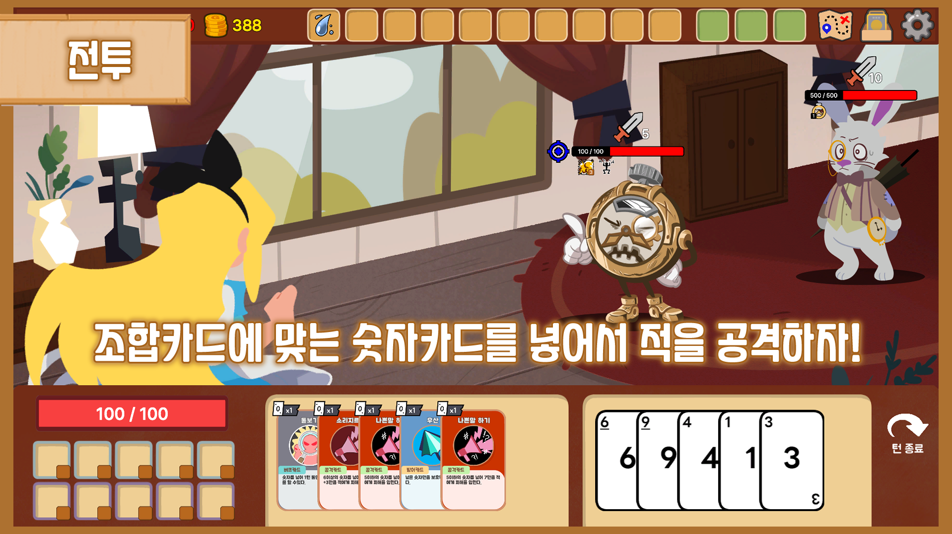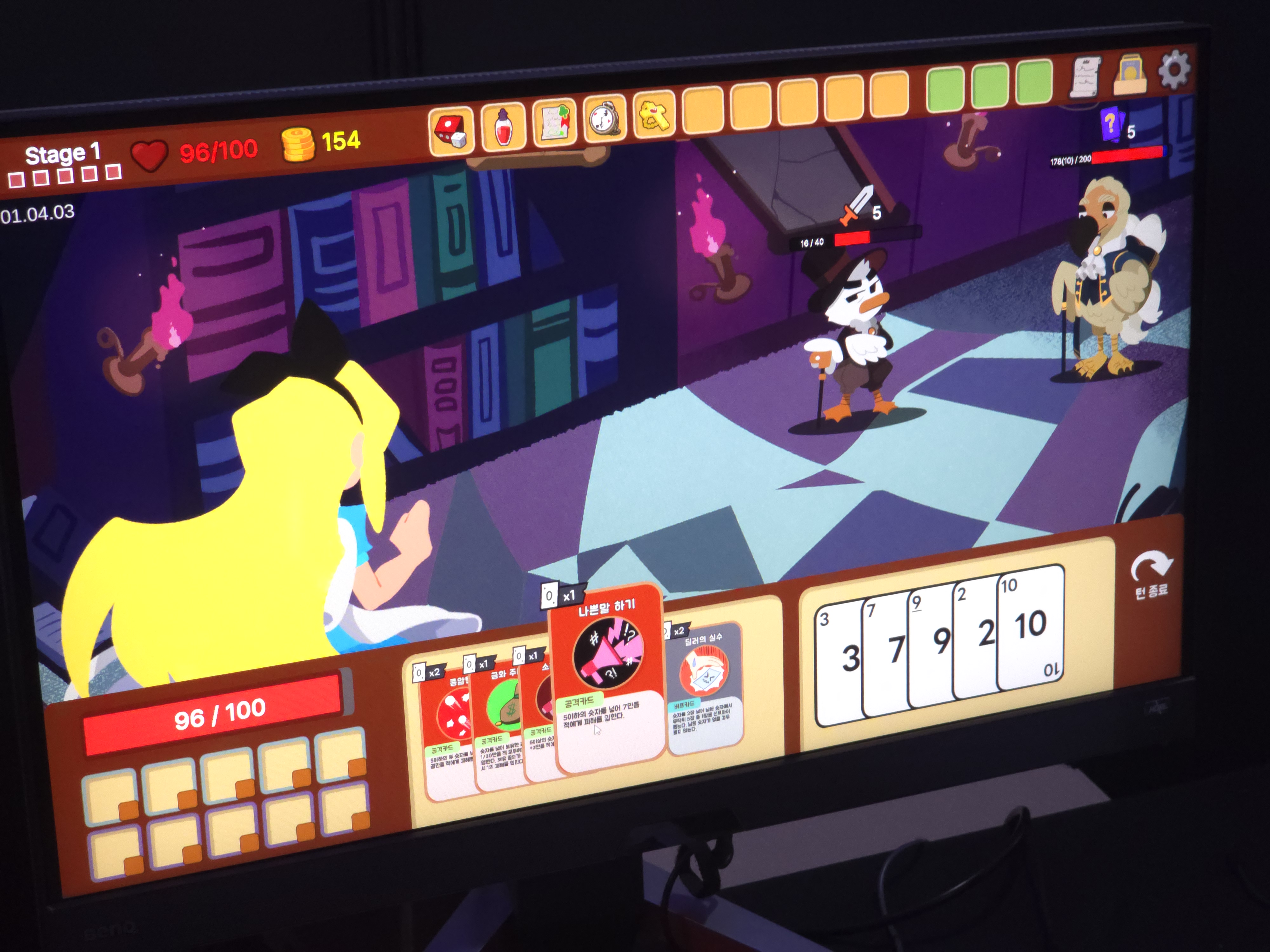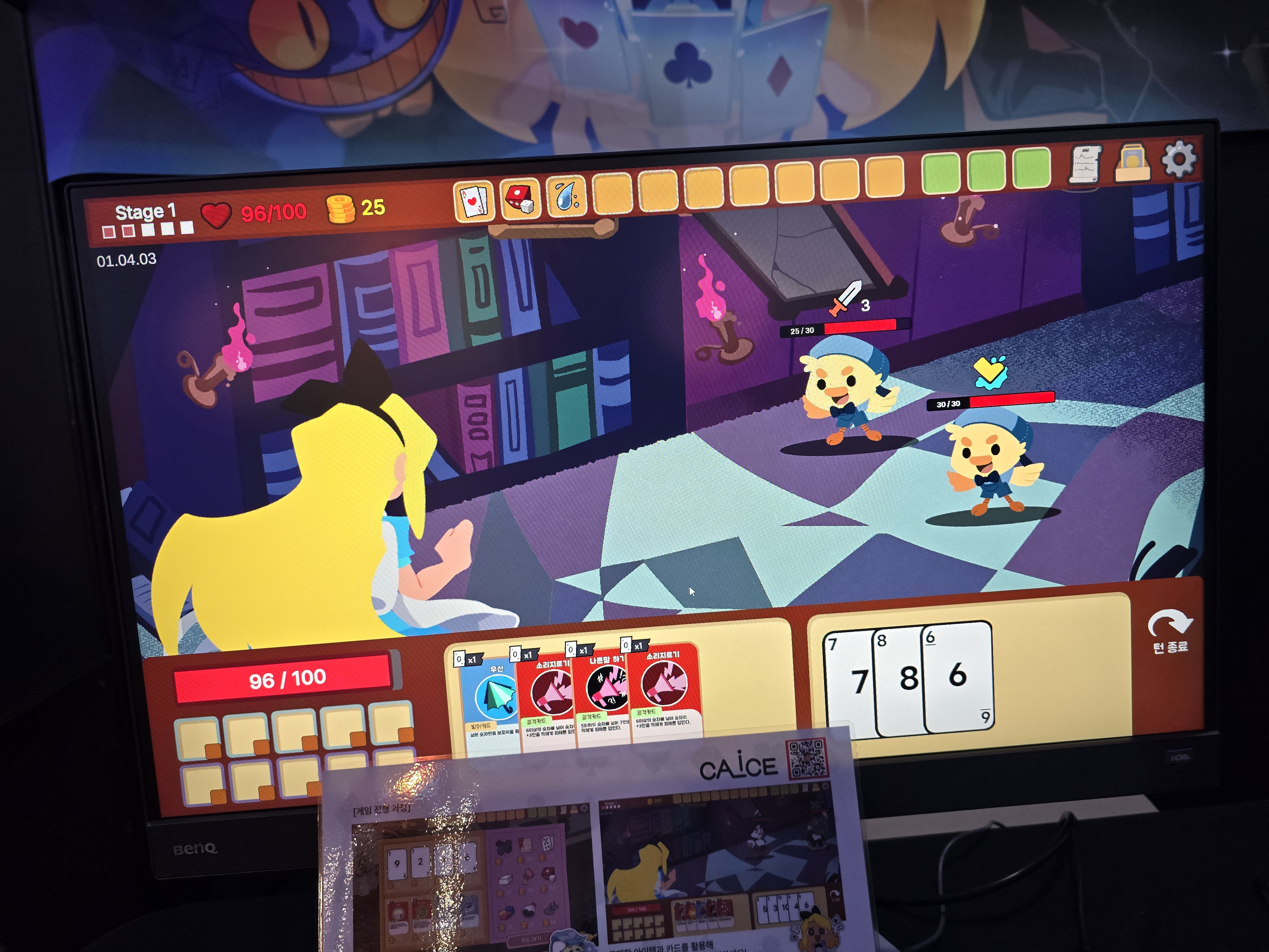 마지막으로 소개할 게임은 네시야의 <칼리스>다. ‘칼리스’라는 게임명이 ‘카드(Card)’와 ‘앨리스(Alice)’를 섞은 단어인 만큼, 이 게임은 유명 동화 ‘이상한 나라의 앨리스’를 테마로 한 덱빌딩 로그라이트 게임이다.