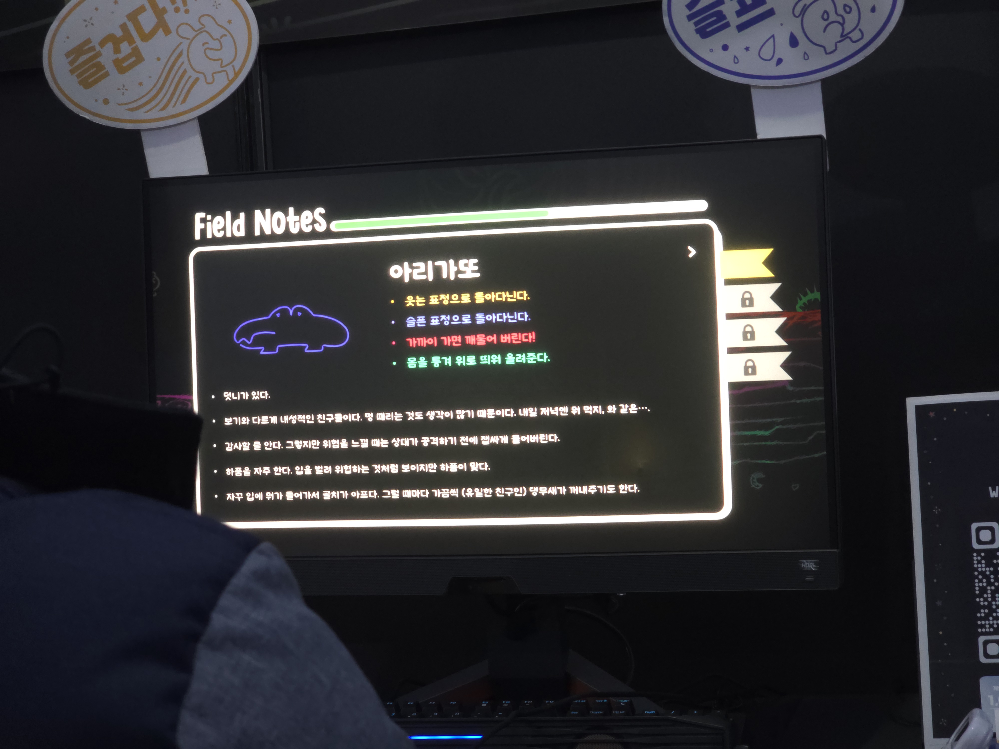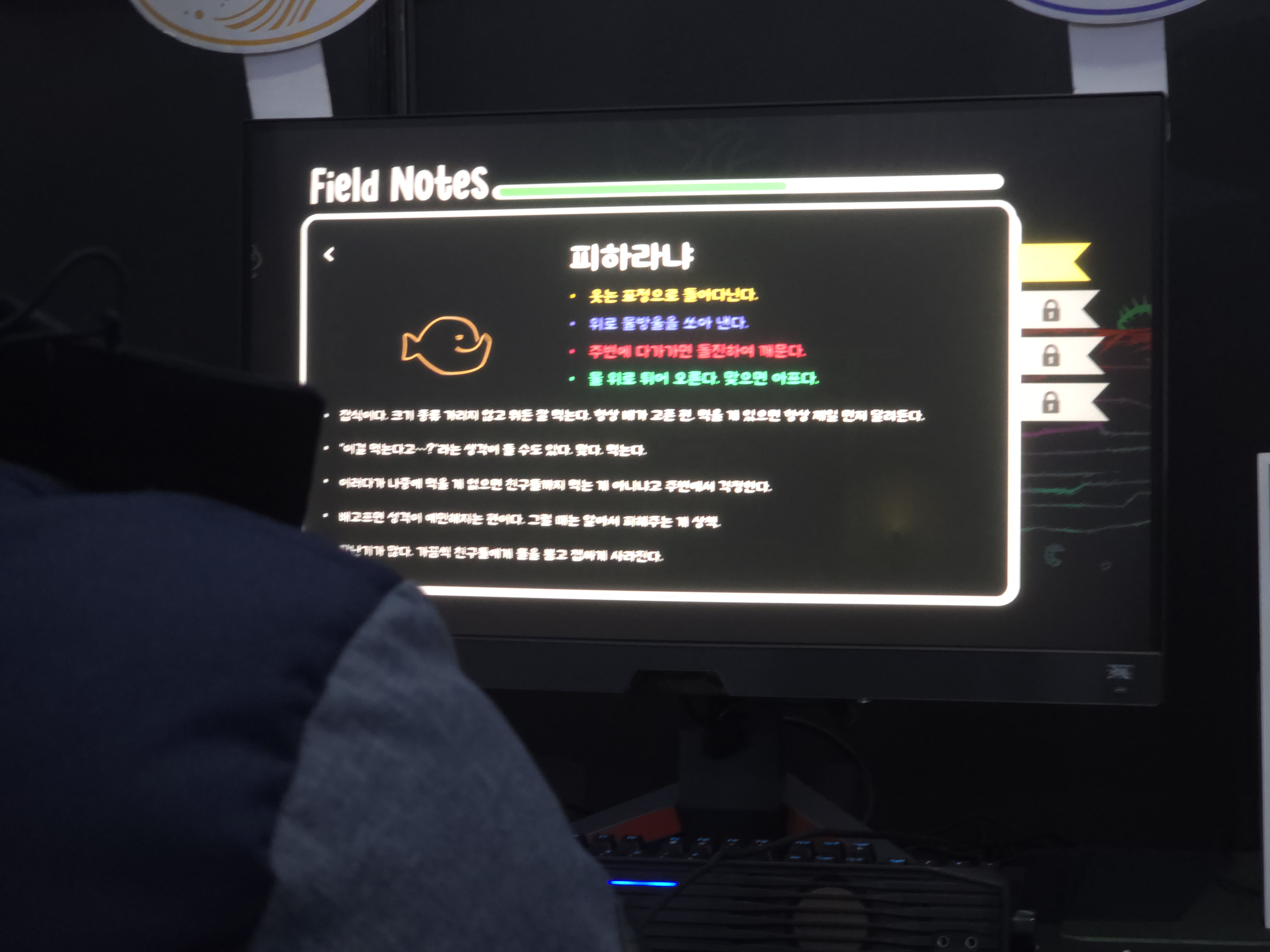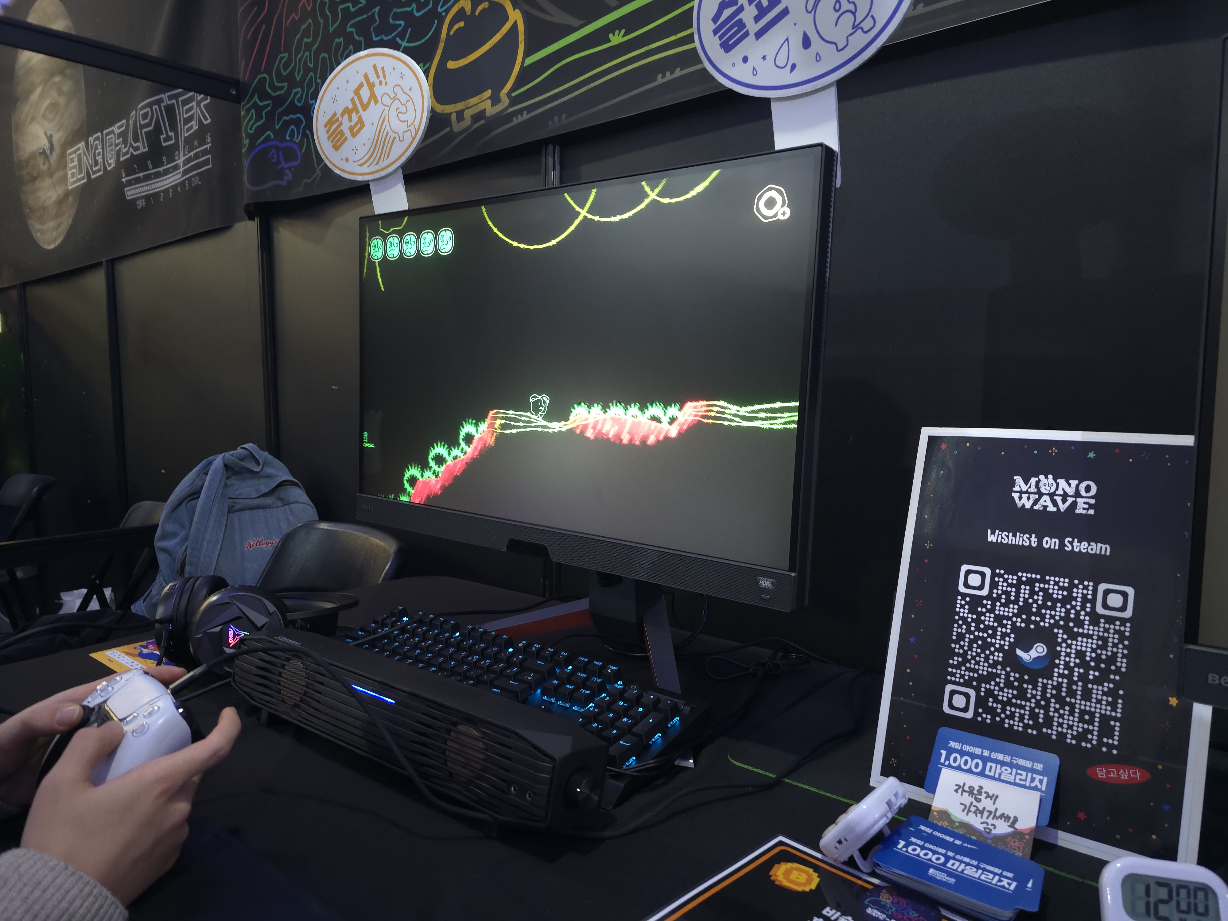 이처럼 버닝 비버는 앞으로의 대한민국 게임계를 책임지는 미래의 기대작 인디게임 83종이 전시되어 있었으며. 총 2부작으로 나눈 이번 기사에서는 필자가 직접 체험한 인디게임 10개를 선정해 직접 체험하고 소개하는 시간을 가지기로 했다. 이번 파트 2에서는 ▲샤이닝 고라니의 <고수아비> ▲BBB의 <모노웨이브> ▲시계태엽고양이의 <타임 스내쳐 밴디> ▲실로폰의 <아이러니> ▲네시야의 <칼리스>를 소개하도록 하겠다.