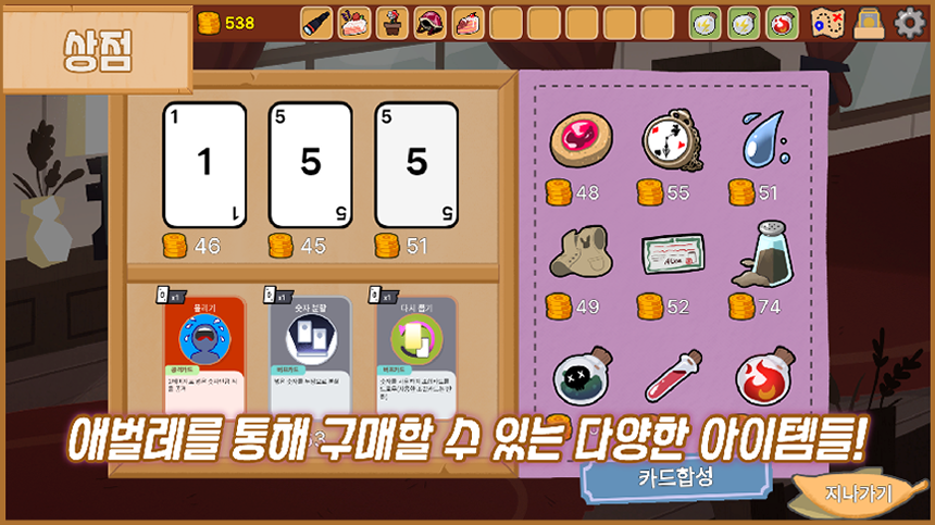 칼리스에서는 게임을 시작하기 전에 플레이어가 ‘조건 카드’와 ‘숫자 카드’를 받게 된다. 조건 카드는 특정 효과나 발동 조건을 지니고 있으며, 숫자 카드는 이 조건 카드를 활성화하기 위한 숫자로 구성됩니다. 플레이어는 이 두 종류의 카드를 전략적으로 조합해 최적의 덱을 구성해야 하지만, 활성화하기 위한 숫자 카드는 ‘5 이하’, ‘각 수의 합’ 등 간단한 사칙연산으로 조합이 가능해, 게임의 난이도 또한 비교적 쉽게 느껴질 수 있다. 각 스테이지의 특징과 적의 패턴에 맞게 덱을 조정하는 것 또한 게임이 요구하는 것 중 하나이며, 게임 진행 중 새로운 카드를 획득하거나 재화나 특수 효과를 통해 기존 카드를 강화하여 더욱 강력한 덱을 만들거나, 적을 향한 디버프를 거는 등 다양한 플레이를 지원한다.