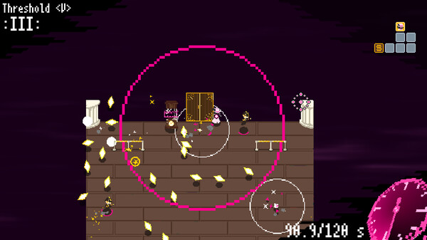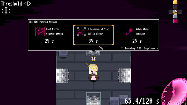 7번째로 소개할 게임은 시계태엽고양이의 <타임 스네쳐 핸디>이다. 이 게임은 탄막 로그라이크 슈팅게임으로, 플레이어는 주인공 시간 박물관에서 유물을 훔치는 ‘핸디’가 되어 박물관 경비를 물리치는 일종의 깽판(?)을 치는 게임이다. 플레이어는 밴디가 되어 빠르게 날아오는 경비병의 탄막을 피하면서 동시에 공격해야 하는 긴장감 넘치는 게임플레이를 경험할수 있으며, 로그라이크 요소로 인해 매 플레이마다 새로운 맵 구성과 적 패턴을 만나게 되며, 높은 리플레이성을 제공한다.