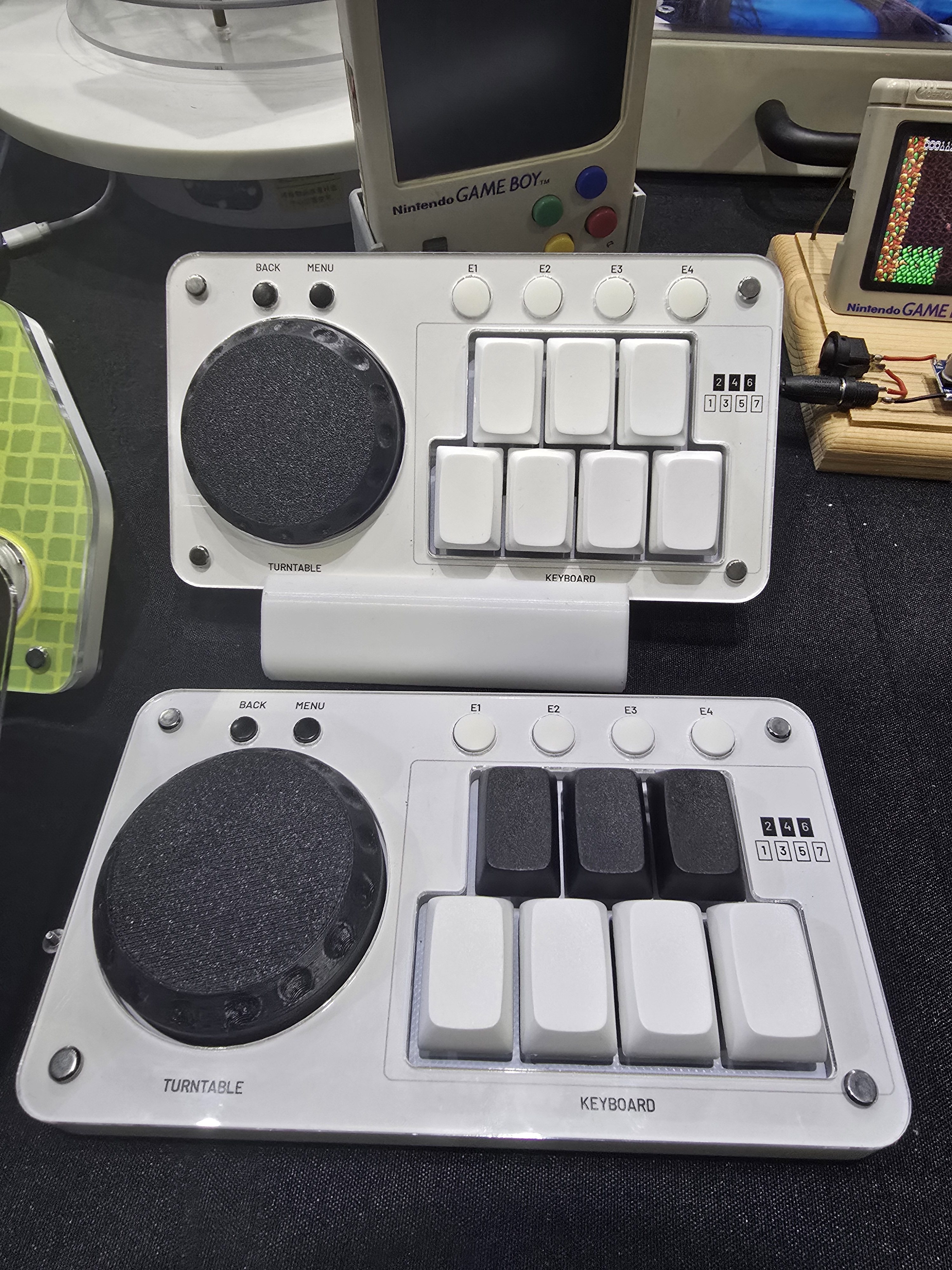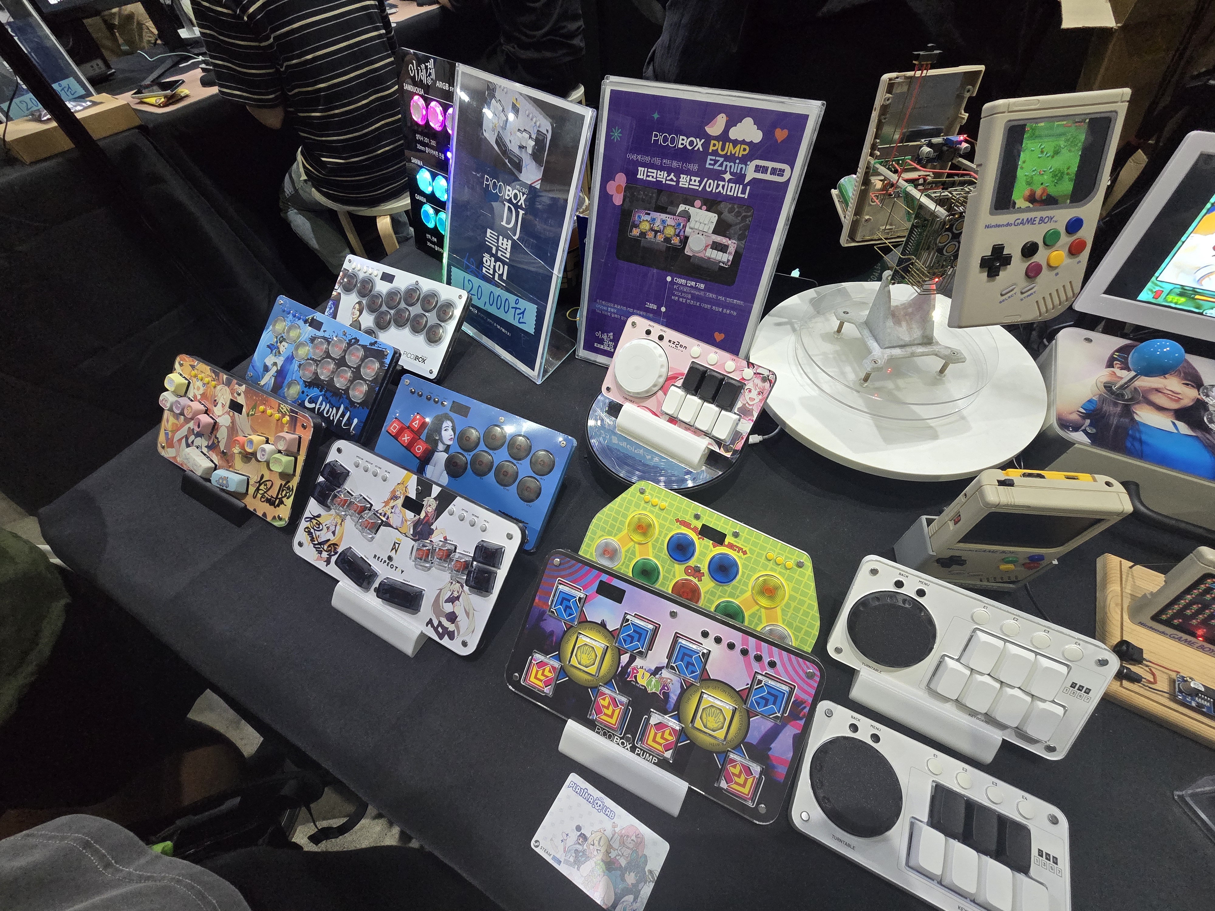가장 먼저 방문한 곳은 독수공방×이세계공방 부스였다. 독수공방은 고전 게임과 격투 게임용 컨트롤러 제작을 전문으로 하고, 이세계공방은 저가형 리듬게임 컨트롤러 제작에 특화된 업체로, 이 두 회사의 협업으로 마련된 부스는 기계식 키보드 입력 체계를 활용한 다양한 혁신적인 컨트롤러를 선보이며 많은 관심을 끌었다.