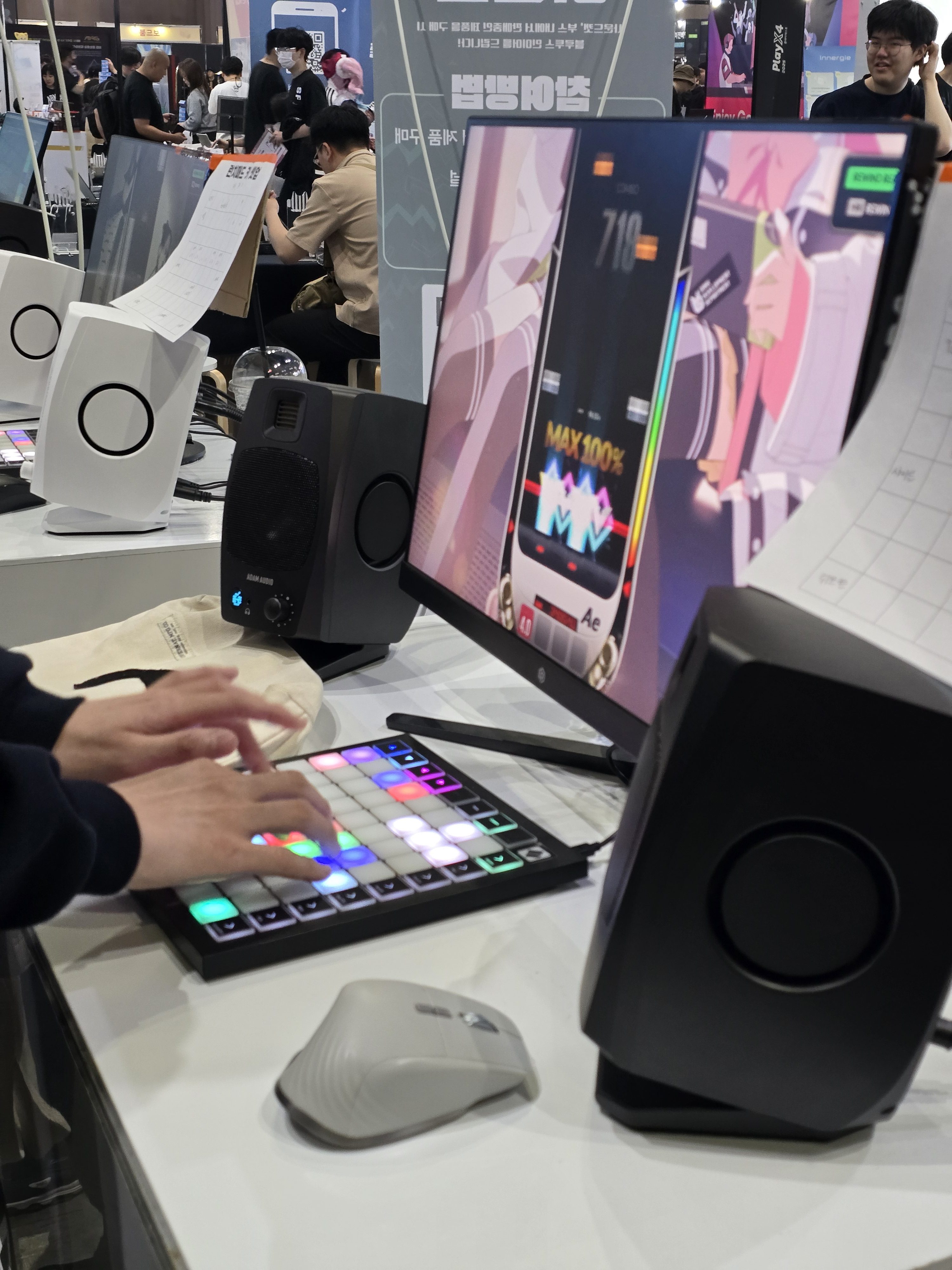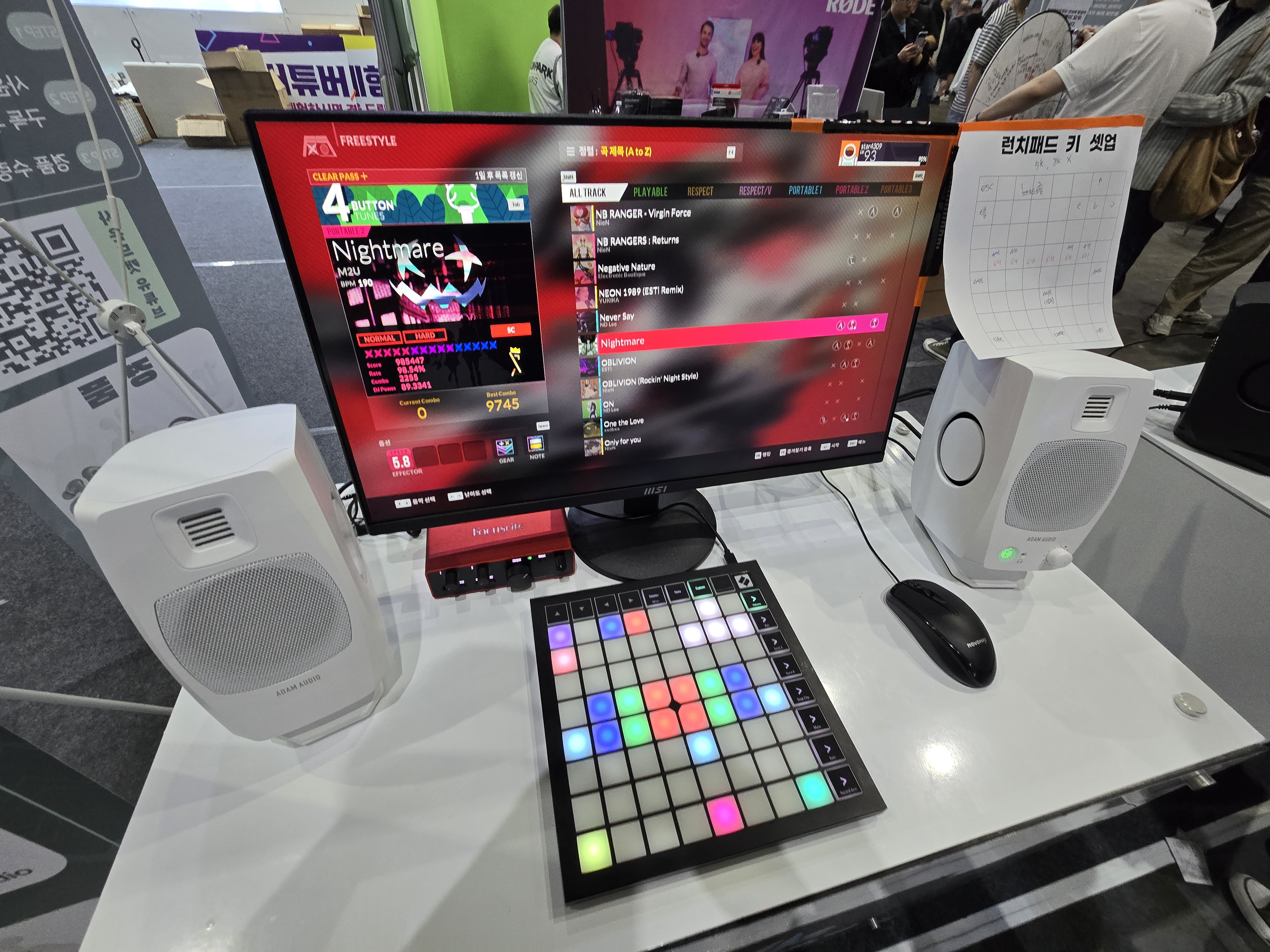 그런데 이 부스를 이번 기사에서 다루게 된 이유는 특별히 주목할 만한 현장 이벤트가 진행되었기 때문이다. 사운드랩 부스에서는 ‘Novation Launchpad X’라는 모델을 중심으로 두 가지 이벤트가 열렸는데, 첫 번째는 에스파의 ‘Whiplash’를 런치패드로 연주하는 도전 과제였고, 두 번째는 ‘런치패드로 리듬게임(디제이맥스) 하기’라는 독특한 이벤트였다. 런치패드의 64버튼이라는 특별한 디자인 덕분에 플레이 자유도가 굉장히 높아 보였으며, 현장에서 제공된 튜토리얼에서도 일반적인 키보드 배열과 유사한 키 배치가 소개되어 있기에, 호기심을 느껴 직접 도전해보기로 했다.