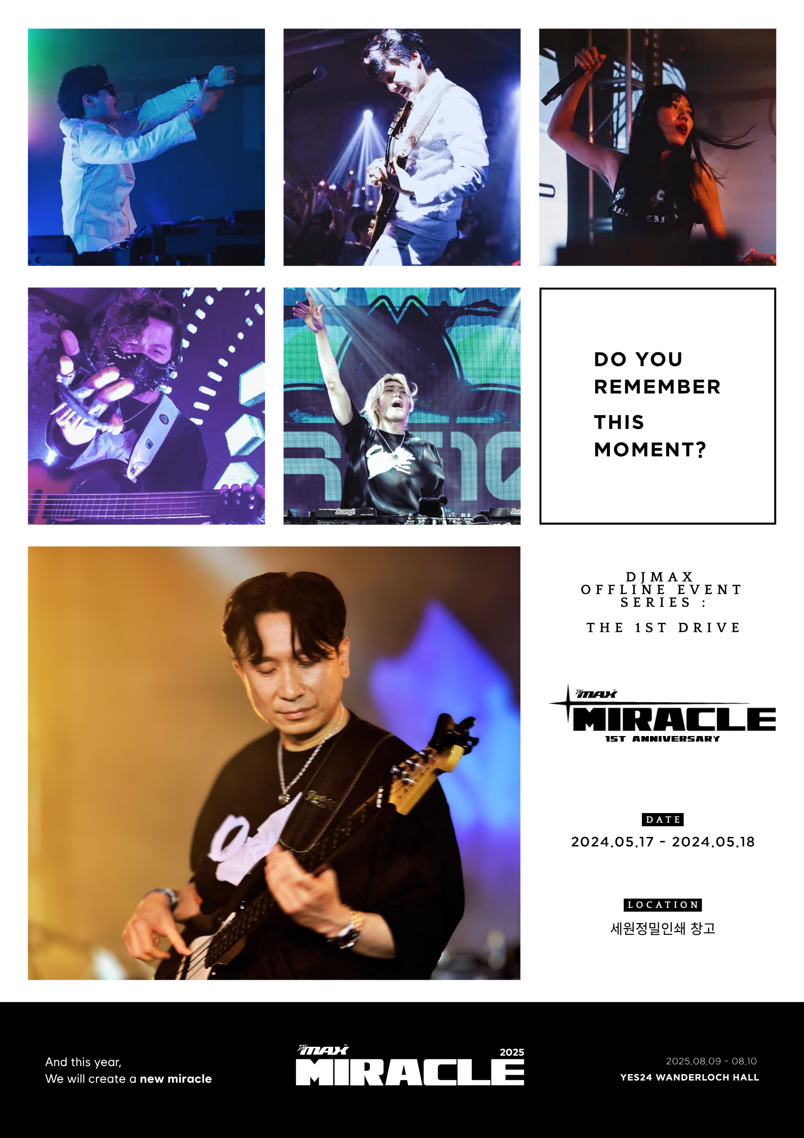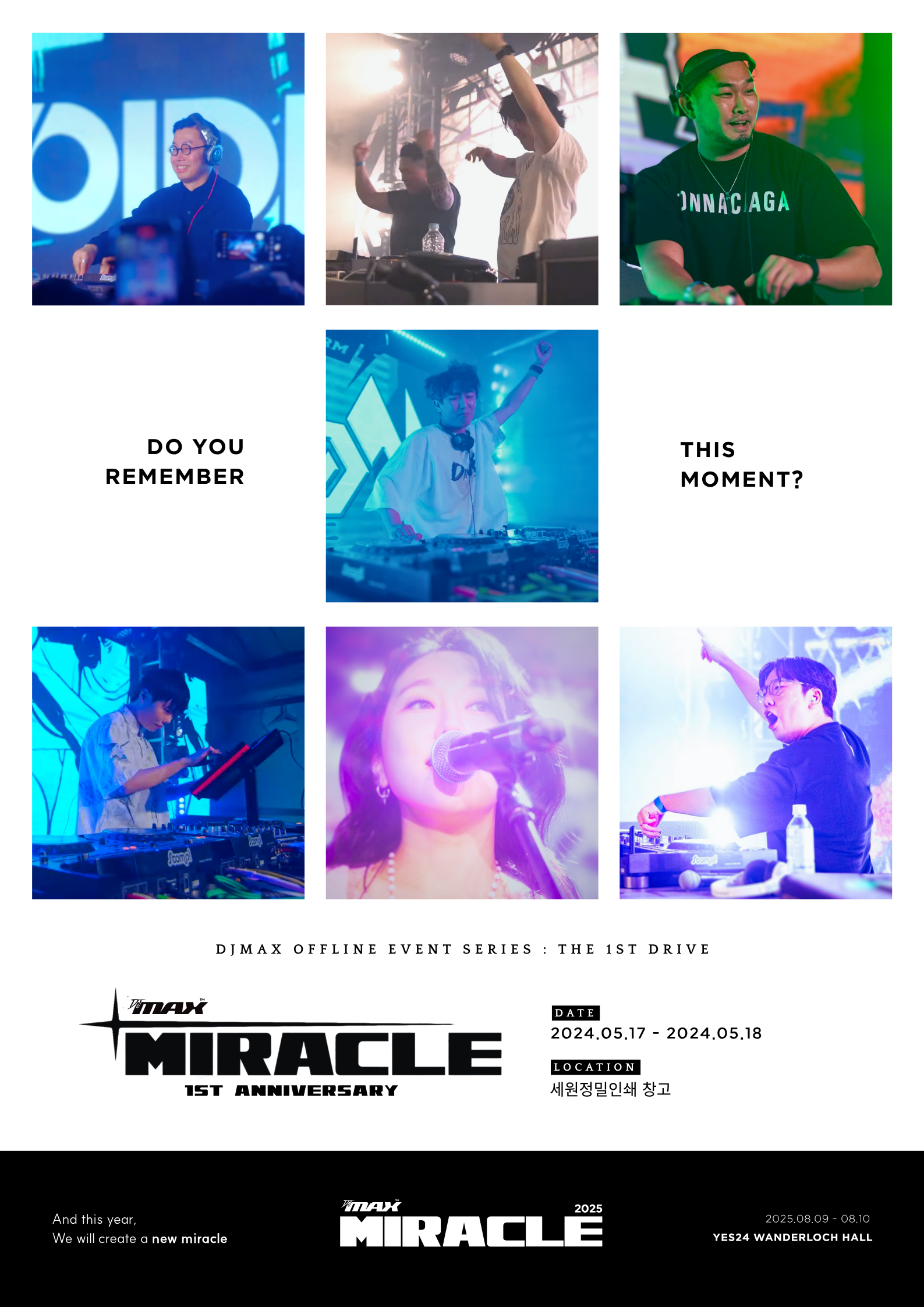 지난 2024년 5월, <DJMAX LIVE MIRACLE> 이후 17년 만에 개최되어 수많은 디제이맥스 팬들에게 잊지 못할 추억을 선사한 오프라인 콘서트 ‘DJMAX MIRACLE : DRIVE(디제이맥스 미라클 : 드라이브)’는 디제이맥스 신곡팩 참여진의 열정적인 디제잉과 무대를 함께 즐긴 팬들의 열정으로 가득했고, 공연 그 자체로 하나의 거대한 축제이자 팬들의 가슴에 디제이맥스의 건재함을 알리는 강렬한 신호탄이 되었다. 지난 <2024 K리겜 연말정산>의 디맥 미라클 관련 설문조사에서 ‘내년 미라클에도 참여할 것인가’에 대한 설문 결과가 ‘그렇다’의 비중이 171명 중 168명, 무려 99%에 달했으니 이는 디제이맥스 시리즈의 외연 확장을 이끌 디제이맥스 엔터테인먼트의 화려하고도 최고조인 시발점이었다. 하지만 뜨거웠던 열기만큼이나 아쉬움도 존재했는데, 맥주 회사 ‘하이네켄’의 협찬 영향으로 미성년자 참관이 불가능했다는 점과 당시 개최지였던 성수동의 세원정밀창고를 활용했던 공연장은 가장 크게 꼽힌 냉방 시설의 한계와 더불어 전반적인 관람 환경에서 몇몇 문제점을 드러낸 것이 옥의 티로 남게 되었다.