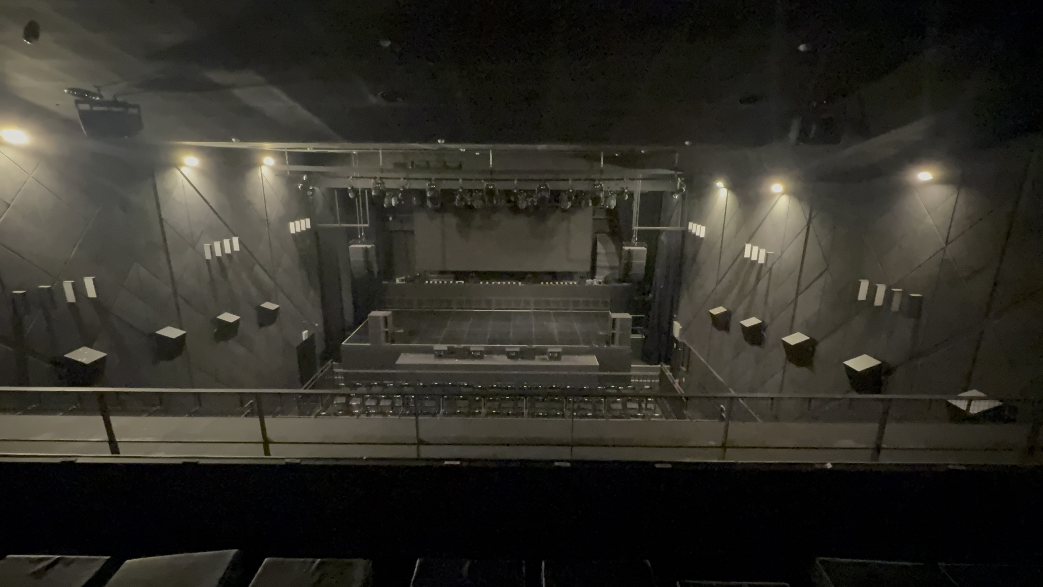 기자님께서 말씀하신 것처럼, 무대 가까이에서는 팬분들이 특히 선호하시는 서브우퍼의 강력한 사운드를 체감하실 수 있습니다. 저희는 스피커들을 위쪽에 배치하여 공연장 전체에 음향이 고르게 퍼지도록 설계했습니다. 그래서 특정 위치, 특히 스피커 바로 앞에서 귀가 아플 정도의 부담감보다는, 무대 앞쪽에서는 서브우퍼의 진동감을 더욱 강하게 느끼실 수 있고, 동시에 딜레이 스피커와 메인 스피커를 통해 다양한 멜로디 라인도 선명하게 들으실 수 있도록 구성했습니다. 여기까지만 봐도 타 공연장 대비 많은 스피커를 준비했다고 볼 수 있습니다.