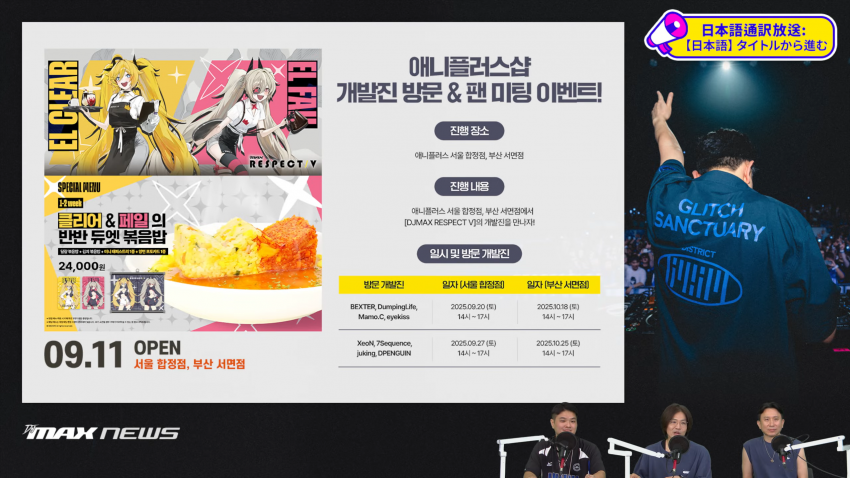 네오위즈는 콜라보 소식과 더불어 연말까지 이어질 구체적인 로드맵을 공개하며 팬들의 기대를 한층 더 끌어올렸다. 먼저, DJMAX RESPECT V의 간판 오리지널 DLC인 ‘V LIBERTY 4’가 연말 방송을 통해 상세 정보와 함께 공개될 예정이라 밝혔으며, 패턴 제작 장인들의 축제인 ‘DPC 2025(DJMAX Pattern-Design Challenge)’가 9월 7일까지 참가 신청을 받는다는 소식 역시 전했다. 또한 DLC 출시일인 9월 11일부터 애니플러스 합정점과 서면점에서 콜라보 카페를 오픈함과 동시에 9월에는 합정점, 10월에는 서면점에서 개발자들이 직접 방문하는 팬미팅 이벤트가 열릴 예정으로 오프라인 팬 커뮤니티 활성화에 기여할 것으로 보인다.