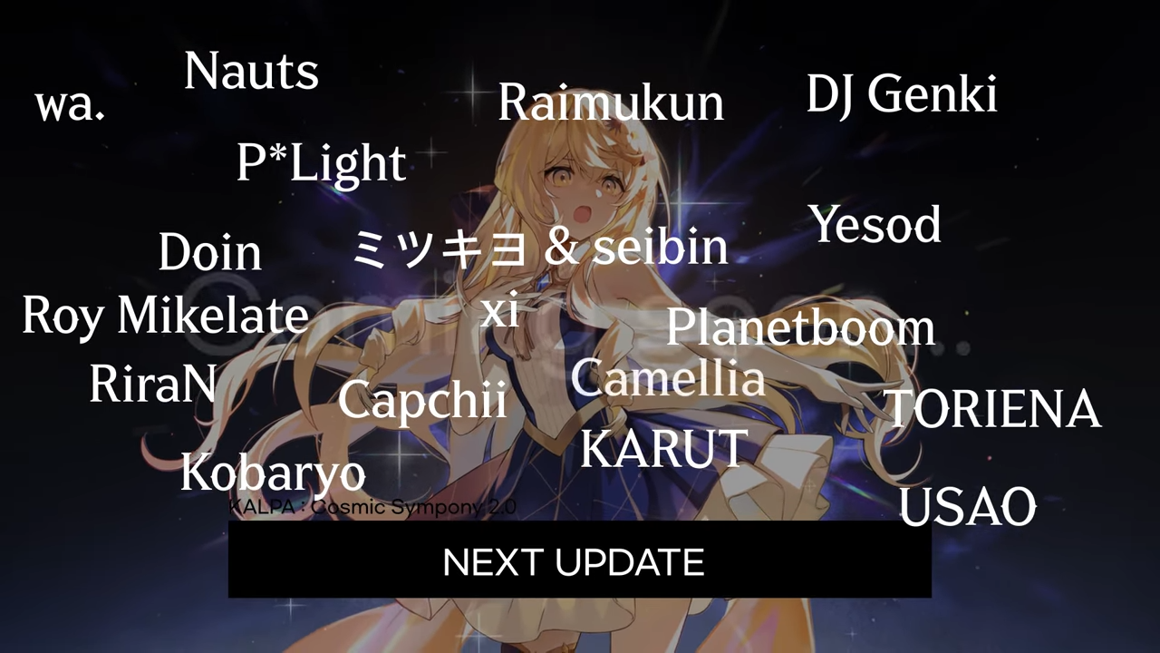 향후 로드맵에도 화제를 이끌고 있다. 원작에서 BMS 장르의 역사, 존중과 재해석을 내세운 인기팩인 MASS RECALL이 ‘MASS RECALL – OMEGA’로 새롭게 출시될 예정이며, 향후 업데이트로 참여가 예정된 아티스트로 Nauts, P*Light, Doin, Roy Mikelate, RiraN, Kobaryo, Planetboom, Camellia, KARUT, TORIENA, USAO 등 총 19명의 인기 아티스트가 예고되어 ‘칼파’의 세계관이 앞으로도 계속 확장될 것임을 시사했다.