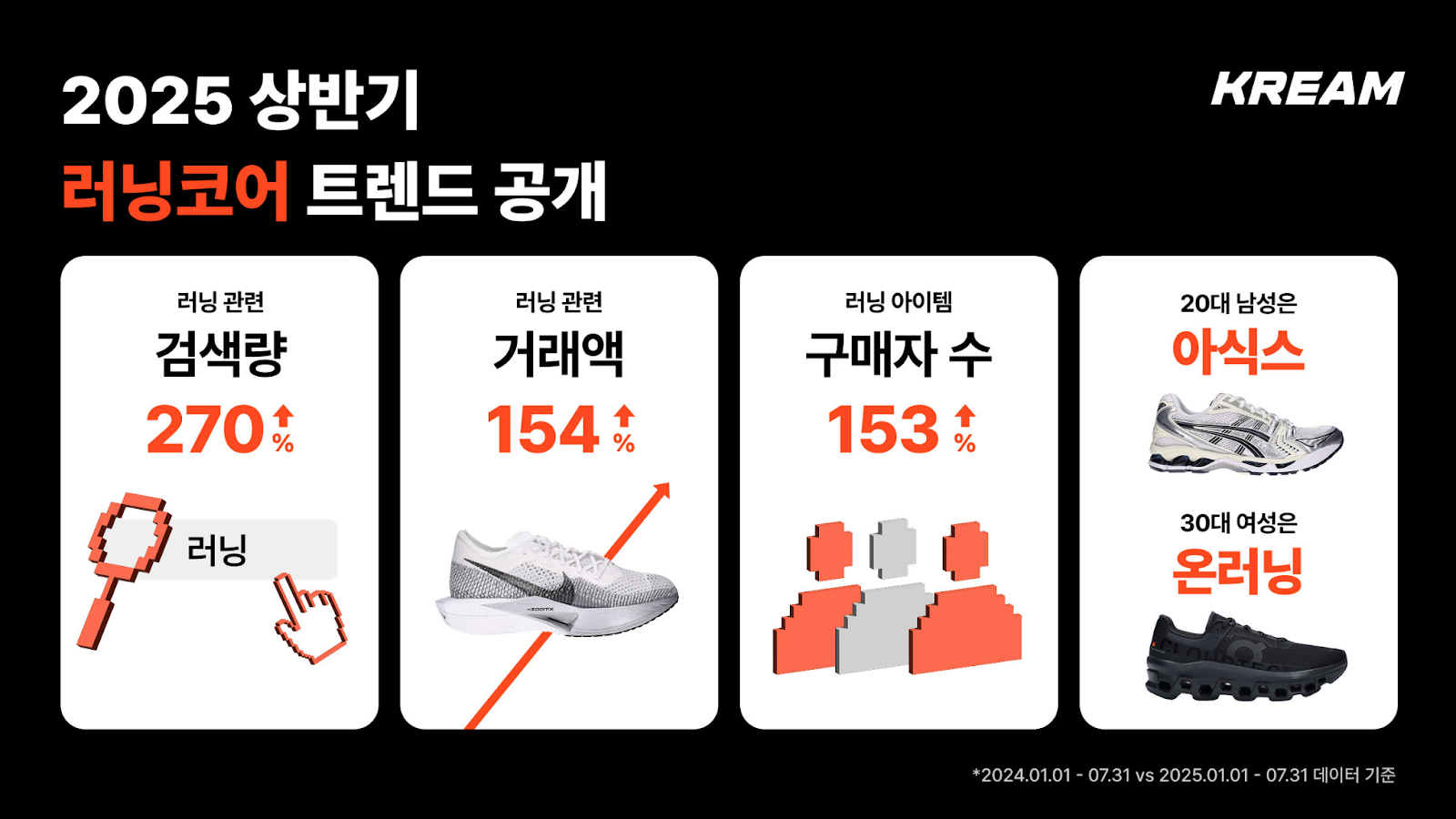 한정판 거래 플랫폼 크림(KREAM, 대표 김창욱)이 2025년 1월부터 7월까지의 ‘러닝코어’ 거래 트렌드 데이터를 발표하며, ‘러닝’ 탭을 신설했다고 밝혔다.