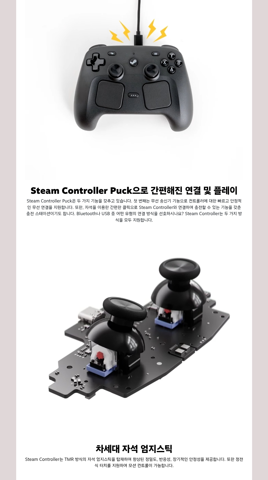 시장에서 빠르게 단종된 ‘스팀 컨트롤러’는 대대적인 사양 상향을 거쳐 돌아왔다. 신형 컨트롤러는 차세대 정밀 자기 섬네일 스틱을 채용하여 내구성과 정확도를 높였으며, 그립 부분에 내장된 자이로 센서, 정밀한 피드백을 제공하는 트랙패드와 고정밀 진동 기능을 새로 탑재했다. 특히 편의성을 높이기 위한 새로운 주변기기 ‘스팀 컨트롤러 퍽(Steam Controller Puck)’이 추가된 점이 눈에 띄는데, 이 기기는 컨트롤러의 무선 송신기 역할을 하는 동시에 거치 시 충전기 기능도 겸하여 사용 편의성을 개선했다.