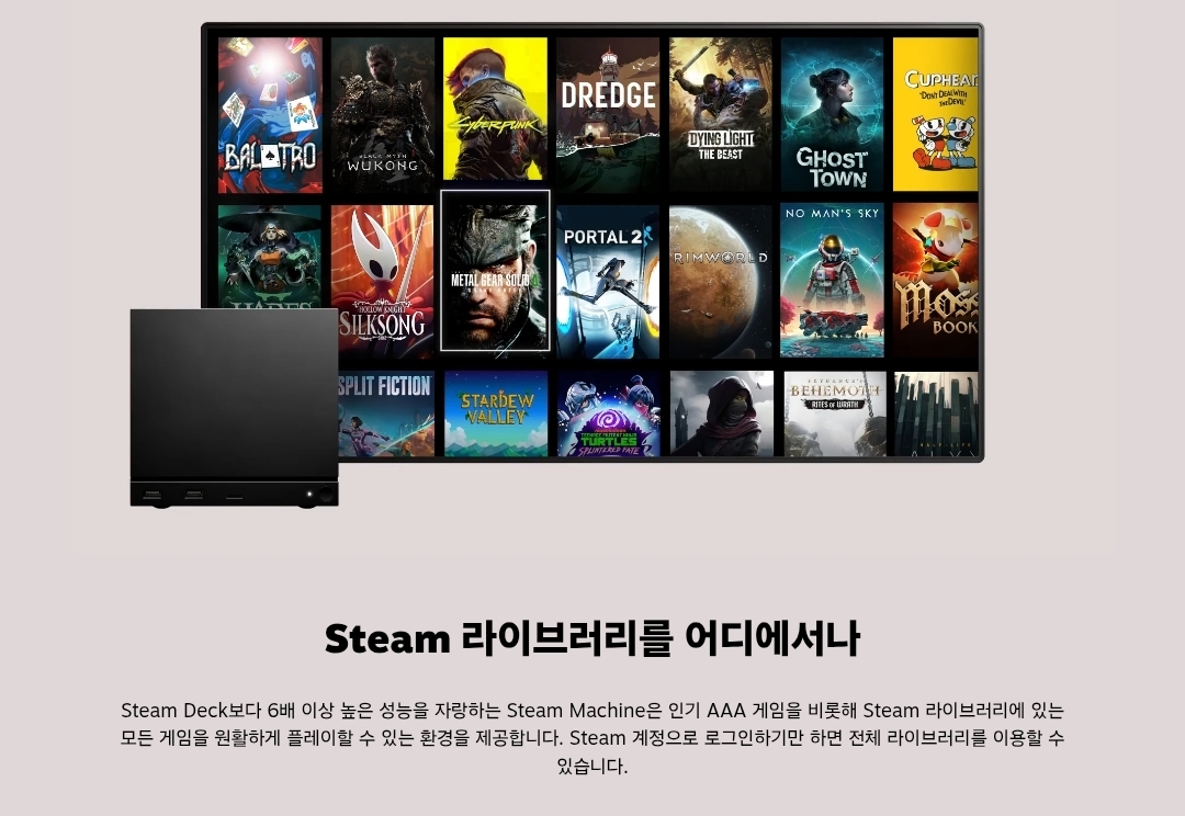 ‘스팀 머신’ 역시 2015년작의 실패를 딛고 새롭게 나오게 되었다. 스팀 머신은 스팀 게임을 위한 게이밍 콘솔 겸 컴퓨터로, 16cm 크기의 정육면체 형태로 디자인되어 공간 활용성을 높였다. 스팀 덱과 동일한 SteamOS를 운영체제로 사용하지만, 그 성능은 기존 게이밍 콘솔 중에서도 손꼽히는 스팀 덱의 약 6배 성능을 보여준다고 하였다.
