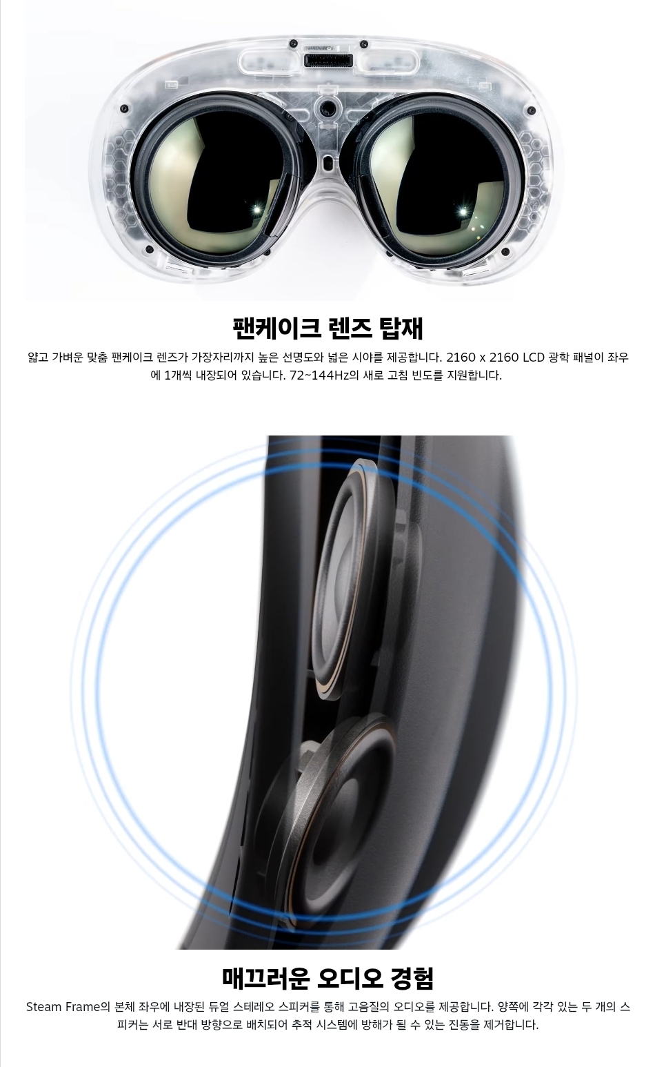 ‘데카드(Deckard)’라는 코드명으로 알려졌던 ‘스팀 프레임’은 PC 연결 없이 단독으로 구동 가능한 무선 VR 헤드셋이다. 퀄컴의 스냅드래곤 프로세서를 탑재하고 스팀OS를 기반으로 작동하여, VR 게임뿐만 아니라 스팀 라이브러리의 모든 게임을 가상 대형 스크린으로 즐길 수 있는 경험을 제공한다.