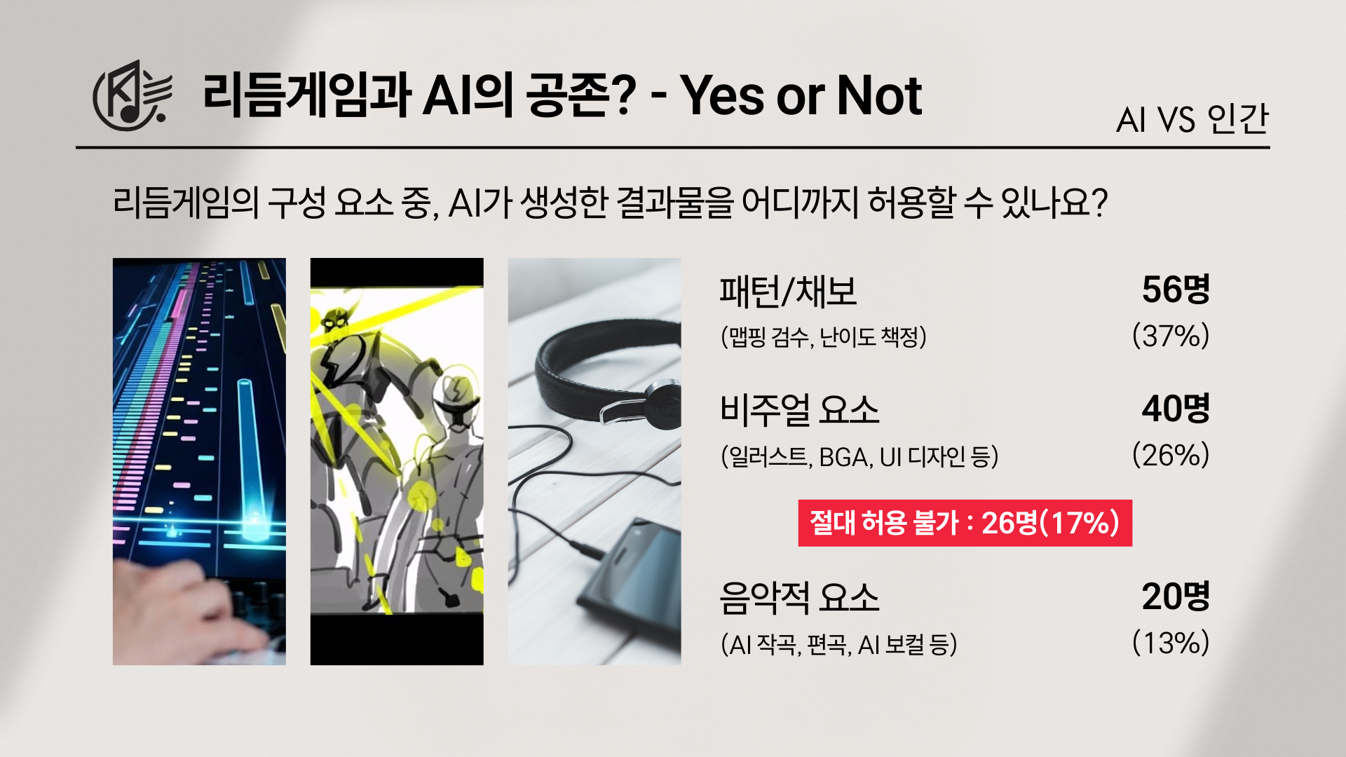 가장 많은 선택을 받은 영역은 패턴이었다. 맵핑 검수와 난이도 책정처럼 ‘플레이 경험의 안전장치’에 해당하는 분야에서 AI 활용을 긍정적으로 본 응답이 56명(37%)으로 1위를 기록했다. 다음은 비주얼로, 자켓 일러스트와 영상(BGA) 영역에서의 AI 활용을 허용할 수 있다는 의견이 40명(26%)으로 뒤를 이었다. 반면 음악적 요소—작곡·편곡·보컬—에 AI가 접근하는 것에 대해서는 20명(13%)으로 상대적으로 낮았다. 그리고 “아예 전부 쓰면 안 된다”는 입장도 26명(17%)에 달했다.
