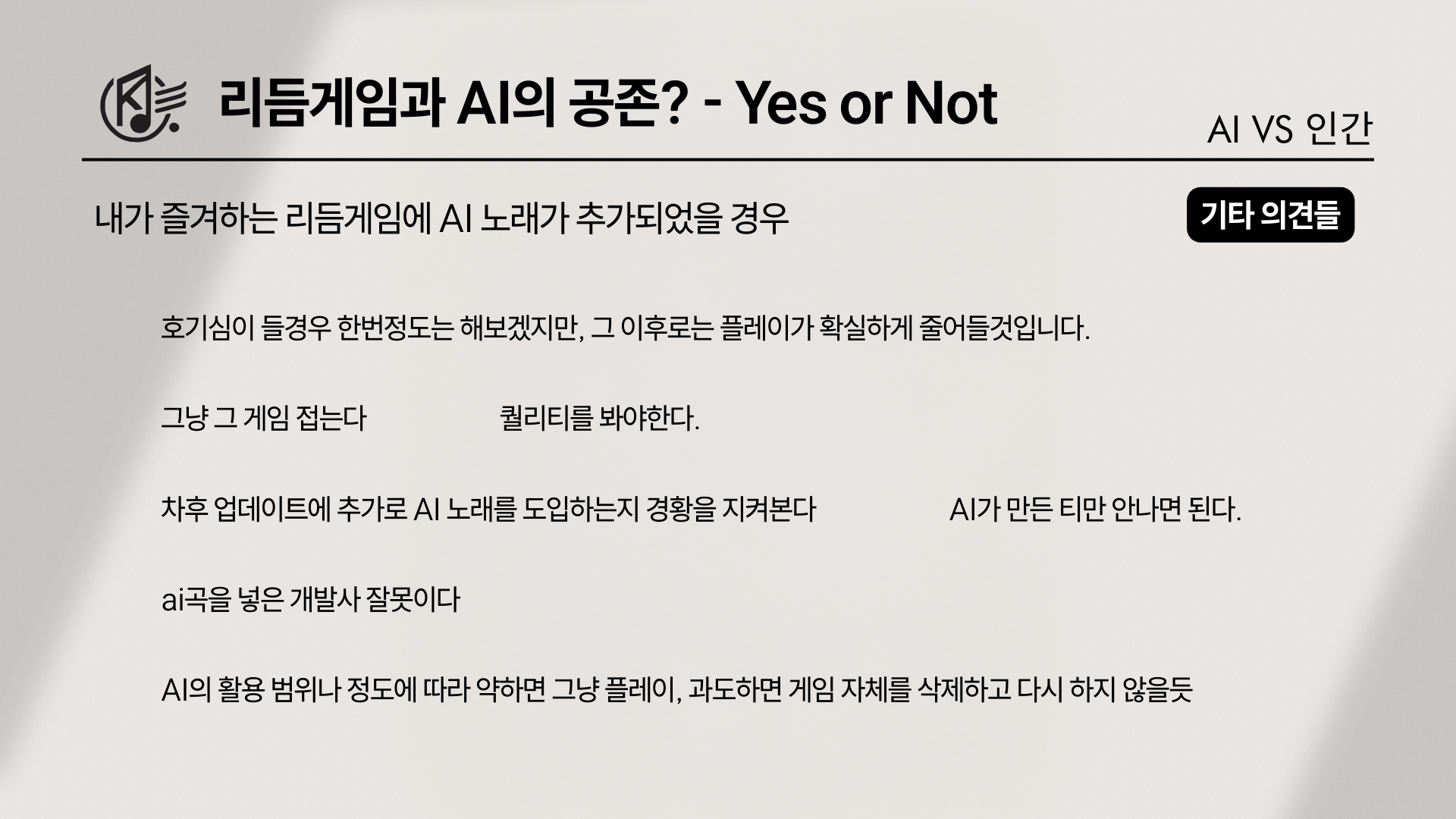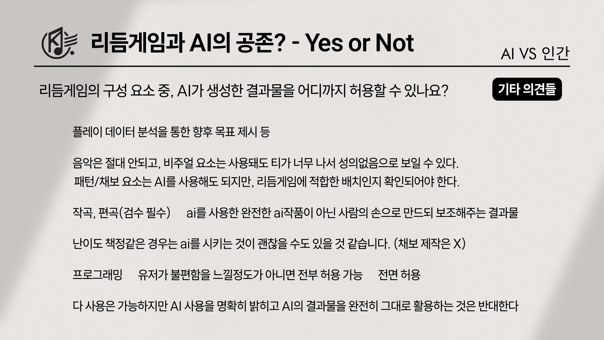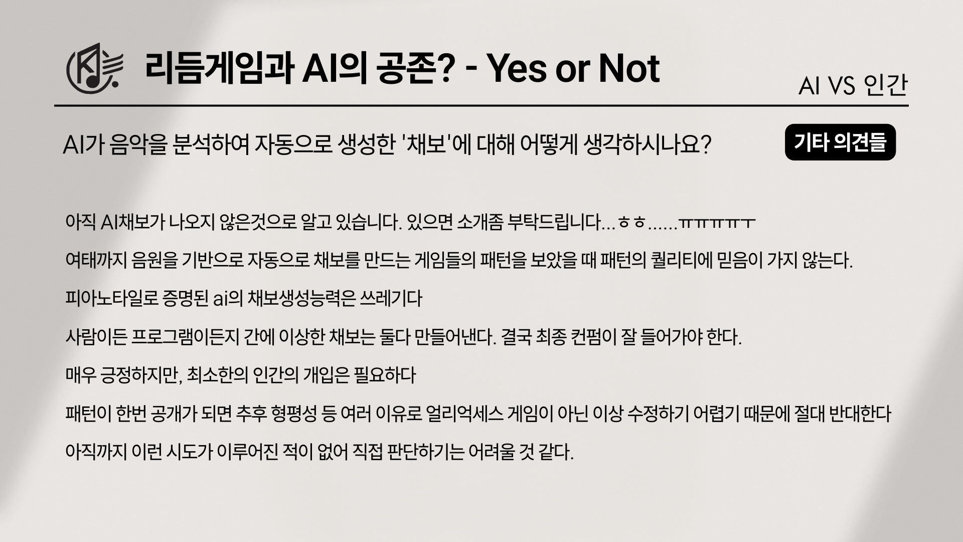 하지만 기타 의견을 보면, 그 낙관이 마냥 순수한 기대만은 아니다. “기존 음원 기반 자동 채보형 게임들의 패턴을 봤을 때 퀄리티가 도저히 믿음이 가지 않는다”거나, “피아노타일로 이미 증명된 AI 채보 생성 능력은 별로다”라는 식으로 ‘가능성’보다 ‘이미 봐온 결과물의 한계’가 먼저 떠올라 기술 무용에 대한 의견이 있었다. 그렇다고 완전 부정으로만 정리되진 않은게, 또 다른 기타 의견들은 채보 AI의 핵심 조건을 비교적 명확하게 제시하였다. ‘최소한의 인간의 개입’과 ‘최종 컨펌의 잘 들어가야 한다’는 인간 개입, 그리고 ‘아직까지 시도가 이뤄지지 않아 판단하기 어렵다’는 중립의 의견에서 보았듯이, 최소한의 개입 그리고 최종 컨펌(검수)의 확실한 존재가 필요하다는 주장이다. 아직 시도가 많지 않아 판단이 어렵다는 의견 역시 “아예 금지”라기보다는 “검증 전까지는 유보”에 가까운 태도였다.