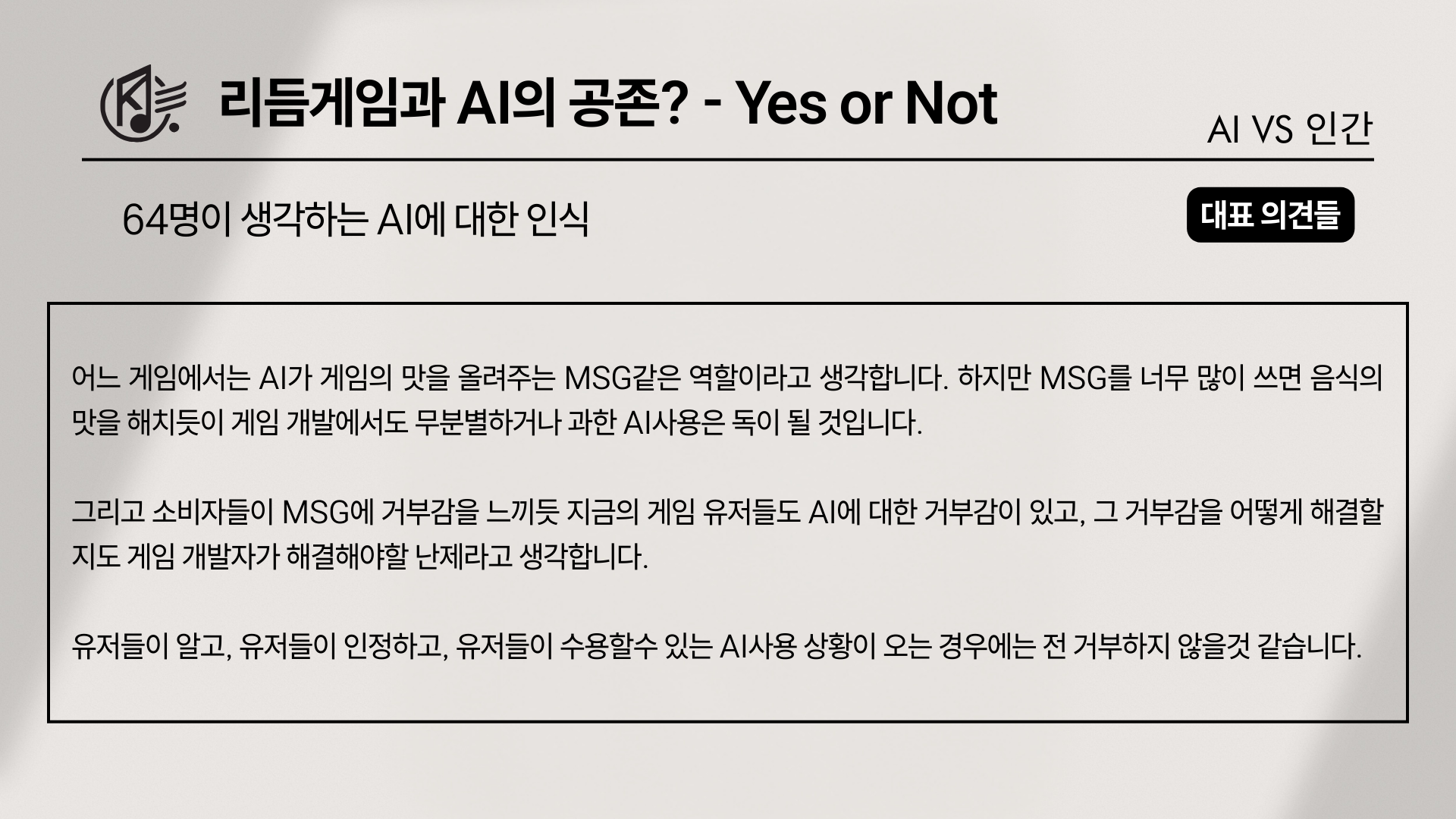 이번 설문의 마지막이자 후일담 문항인 “게임 개발에서의 AI 사용에 대한 본인의 생각을 작성해 달라”는 질문에서도, 각자가 그어두고 있는 ‘선’이 다양한 언어로 드러났다. 기술을 경계하는 사람도, 도구로 받아들이는 사람도, 조건부로 유보하는 사람도 있었다. 하지만 그중에서도 유독 오래 남고, 가장 깊게 울림을 준 답변이 하나 있었다.