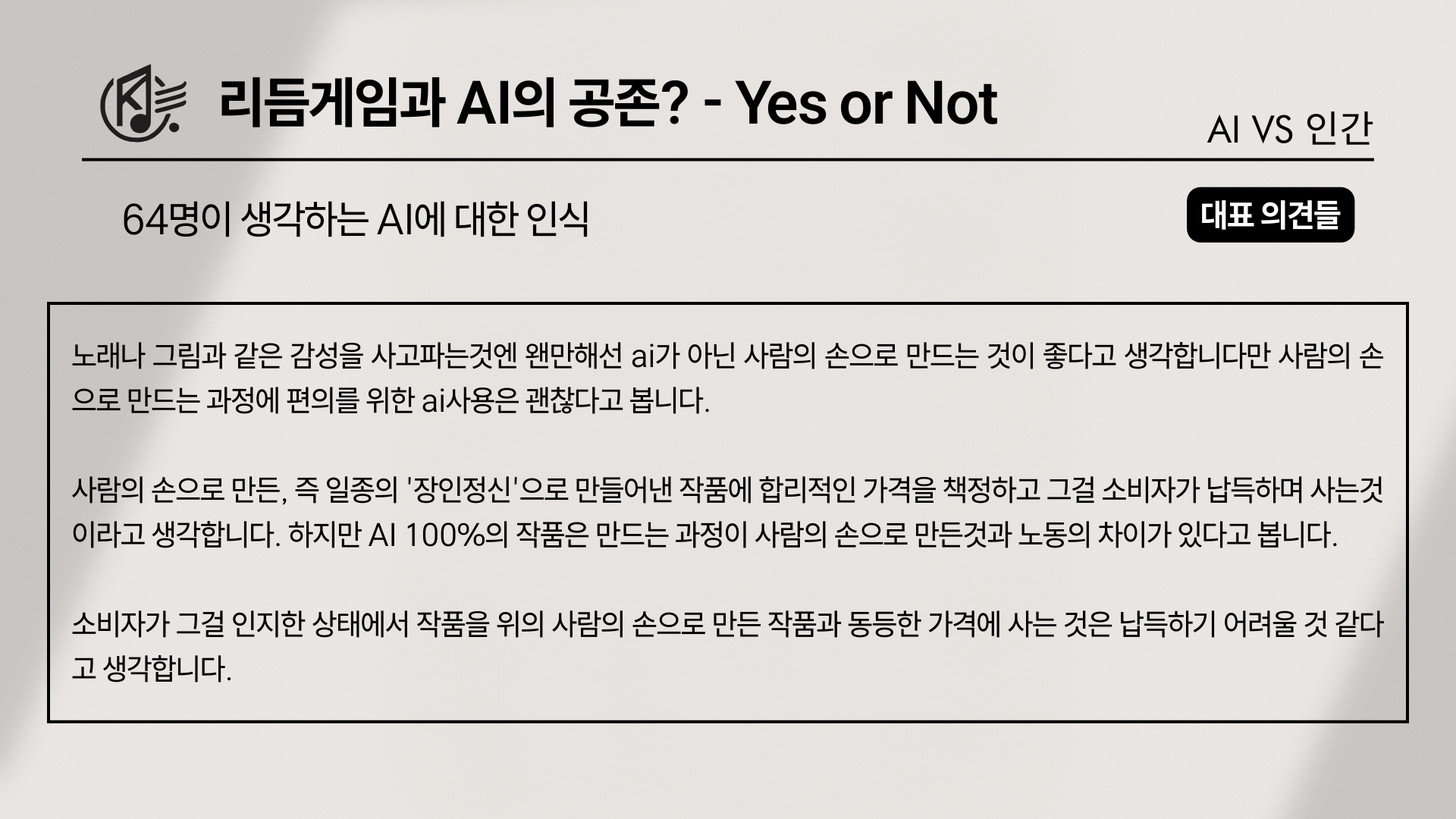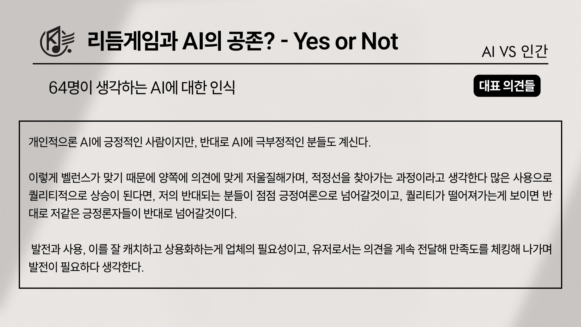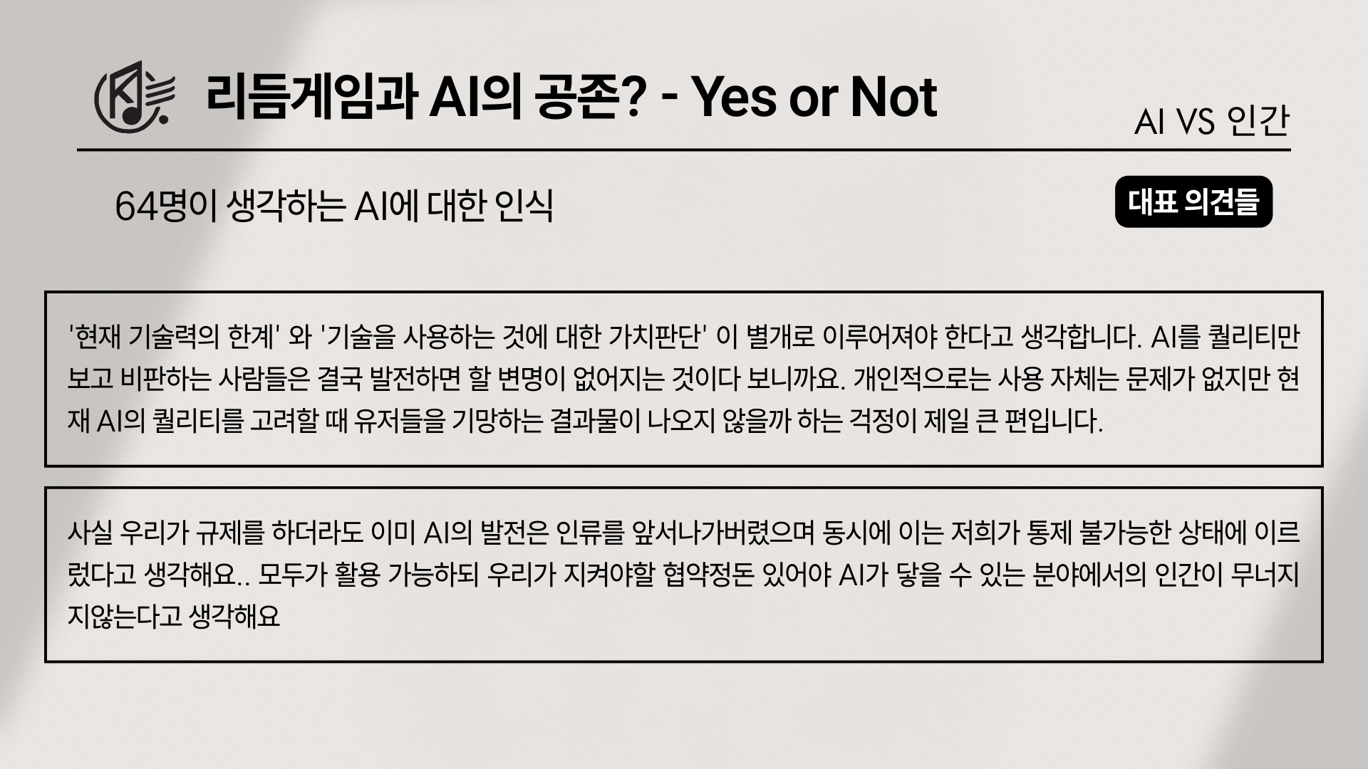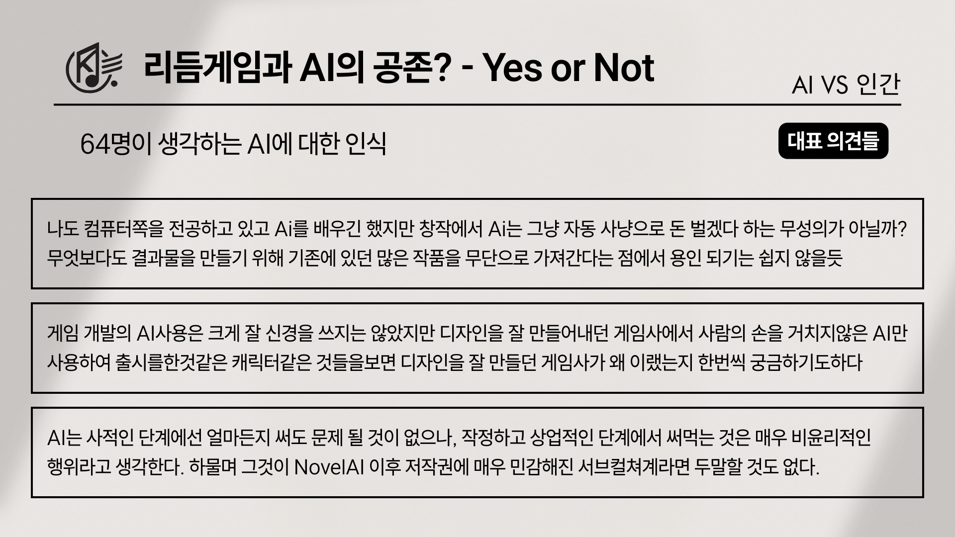 그렇다면 이 3대 요소에 대한 세부적인 접근은 어떻게 나타났을까? 가장 먼저 ‘노래’에 대해 말하자면, ‘리듬게임에 AI 노래가 추가 되었을 경우’를 물었을때, ‘플레이는 하겠지만 기존 작곡가보다 애정이 덜 간다’가 65표(60%), ‘AI 노래가 업뎃한 것만으로도 플레이하지 않겠다’는 과격파가 23표(21%), ‘음악이 좋다면 상관없다’가 13표(12%)로 갈리게 되었다.