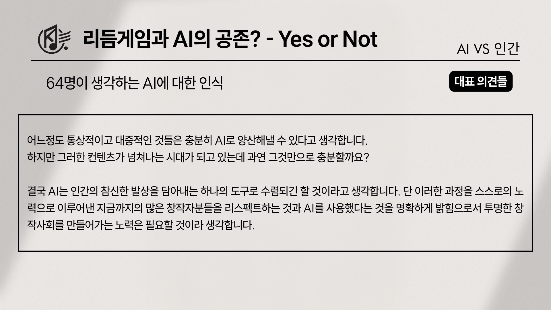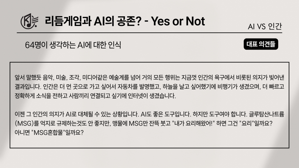 즉, 리듬게임 유저들은 AI를 완전히 부정하는 것도, 무조건 환영하는 것도 아니지만, 최소한 ‘장르의 정체성’이라는 기준 앞에서는 여전히 인간이 만들어낸 가치 쪽에 더 무게를 싣고 있었다. 음악·보컬·비주얼·채보 어디에서든 “보조로는 가능하다”는 의견이 반복되었음에도, “그럼에도 리듬게임은 결국 사람이 만드는 장르여야 한다”는 감각이 결론 문항에서 다시 한 번 확인된 셈이다. 앞서 이야기했던 필자의 걱정과는 달리—그리고 어쩌면 기대대로—아직까지 많은 사람들에게 리듬게임은 단순 기술의 전시장이 아니라 예술을 앞세운 ‘인간 찬가’에 가까운 장르로 남아 있었다.