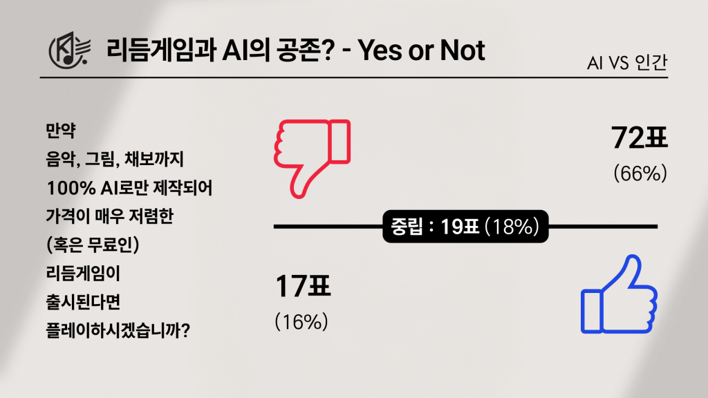 이처럼 3대 요소에 대한 ‘조건부 허용’ 기조는, 다음 설문에서 더욱 선명하게 드러났다. “만약 음악·그림 및 영상(BGA)·채보까지 전부 100% AI로 제작했고, 그 대신 가격이 매우 저렴하거나 무료인 리듬게임이 출시된다면 플레이할 것인가?”라는 질문에 대해, 중립(18%)을 제외한 응답은 반대가 66%, 찬성이 16%로, 무려 50%p 이상의 차이를 보여 극단적으로 갈렸다. 즉 유저들은 “AI가 일부 보조로 들어오는 것”에는 비교적 관대할 수 있어도, 리듬게임을 구성하는 핵심 3요소를 통째로 AI에 맡긴 ‘완전 AI 게임’에 대해서는 가격 메리트가 붙더라도 쉽게 마음을 열지 않았다. 저렴함이나 무료라는 조건보다, 무엇으로 만들어졌는가가 더 큰 판단 기준으로 작동한 셈이다.