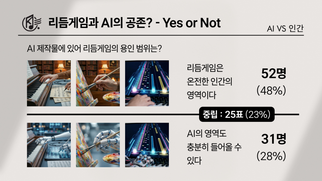 그렇다면 통틀어 보았을 때, AI는 과연 리듬게임에 ‘들어올 수’ 있을까. 설문의 결론에 해당하는 질문—‘AI 제작물에 있어 리듬게임의 용인 범위’—를 물어본 결과, 가장 많은 응답은 “리듬게임은 온전한 인간의 영역”이었다. 52명(48%)으로 과반에 근접한 수치다. 반면 “AI의 영역도 충분히 들어올 수 있다”는 응답은 31명(28%)에 그쳤다.