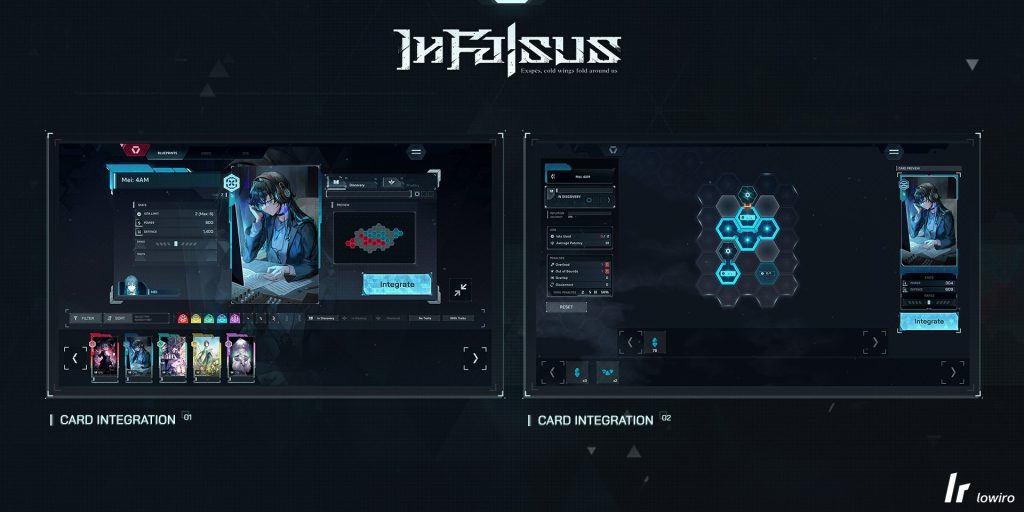 게임 내에서는 각 캐릭터가 고유의 특성을 지니고 있으며, 카드 덱을 활용해 적을 상대하는 ‘카드 인테그레이션’ 시스템이 핵심이다. 카드는 곡을 플레이할 때마다 강화 효과와 보너스를 제공하고, 활용도에 따라 카드 점수에도 영향을 미친다. 곡을 클리어하면 ‘아이오타(Iota)’를 획득할 수 있고, 이를 모아 새로운 카드를 제작할 수 있는 블루프린트 그리드도 마련되어 있다. 카드 일러스트는 다양한 작가들이 참여해 고품질의 이미지를 자랑하며, 최대 다섯 장을 장착해 전략적으로 운용할 수 있다는 점도 특징이다.