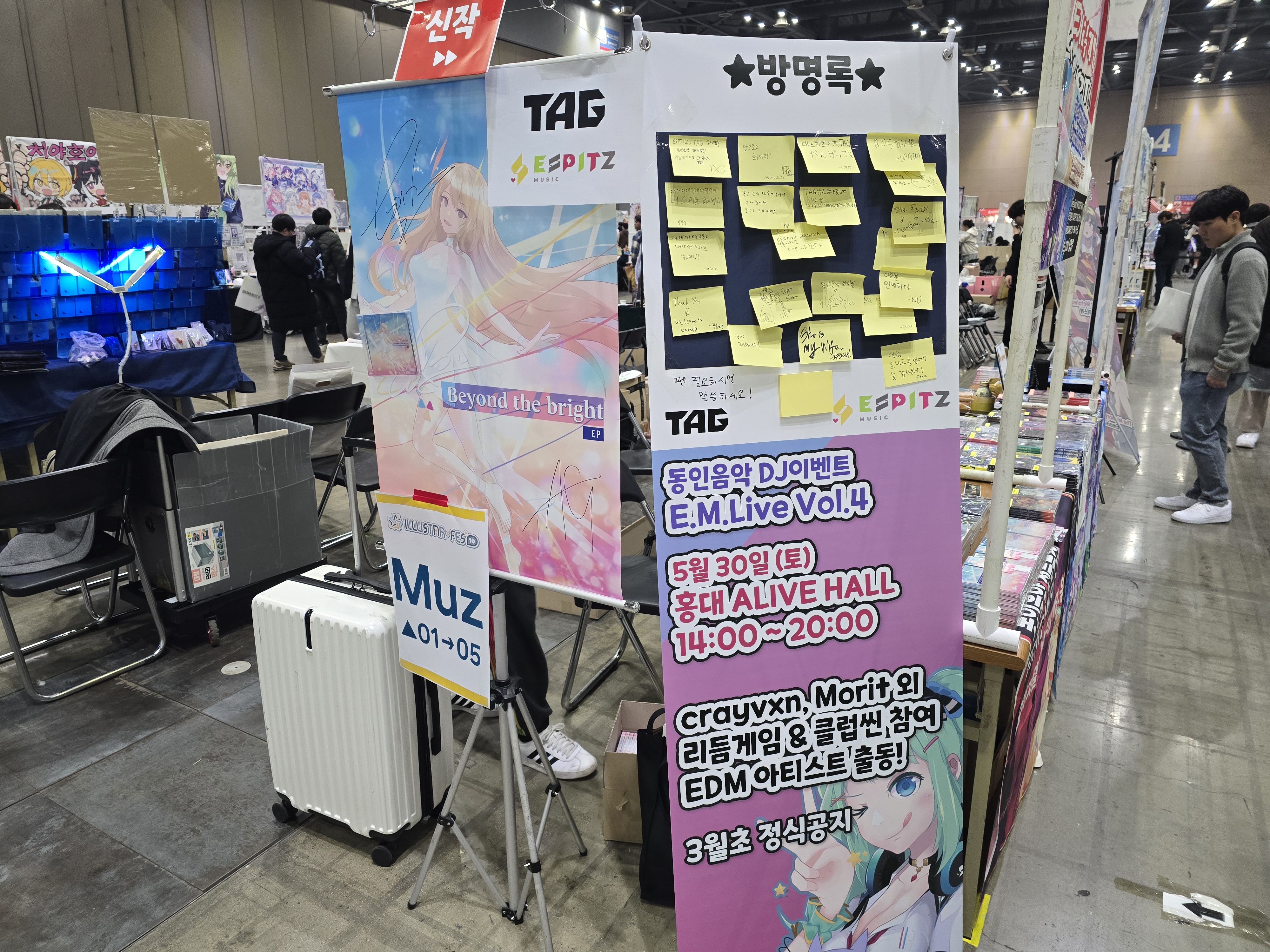 행사장 안에 마련된 ESPITZ MUSIC 부스에는 다양한 디스코그래피가 팬들을 맞이했다. 이번 행사에서 처음 공개된 TAG와의 합작 음반 <Beyond the bright EP>를 비롯해, 쿠로사와 다이스케의 <BLACK ALBUM> 시리즈와 디버스 시스템의 신작 <Stream Palette> 등 여러 위탁 앨범도 함께 판매됐다. 여기에 동방 프로젝트 음반 <Far East Metalworks>, <The Memory of Touhou>와 블루 아카이브 어레인지 앨범 <SCHALE HOUSE>, <뭉개구름 너머>, <피트니스 만담> 등, 서브컬처 팬들의 기대를 채워줄 다양한 신작 라인업이 준비되어 많은 관심을 끌었다.