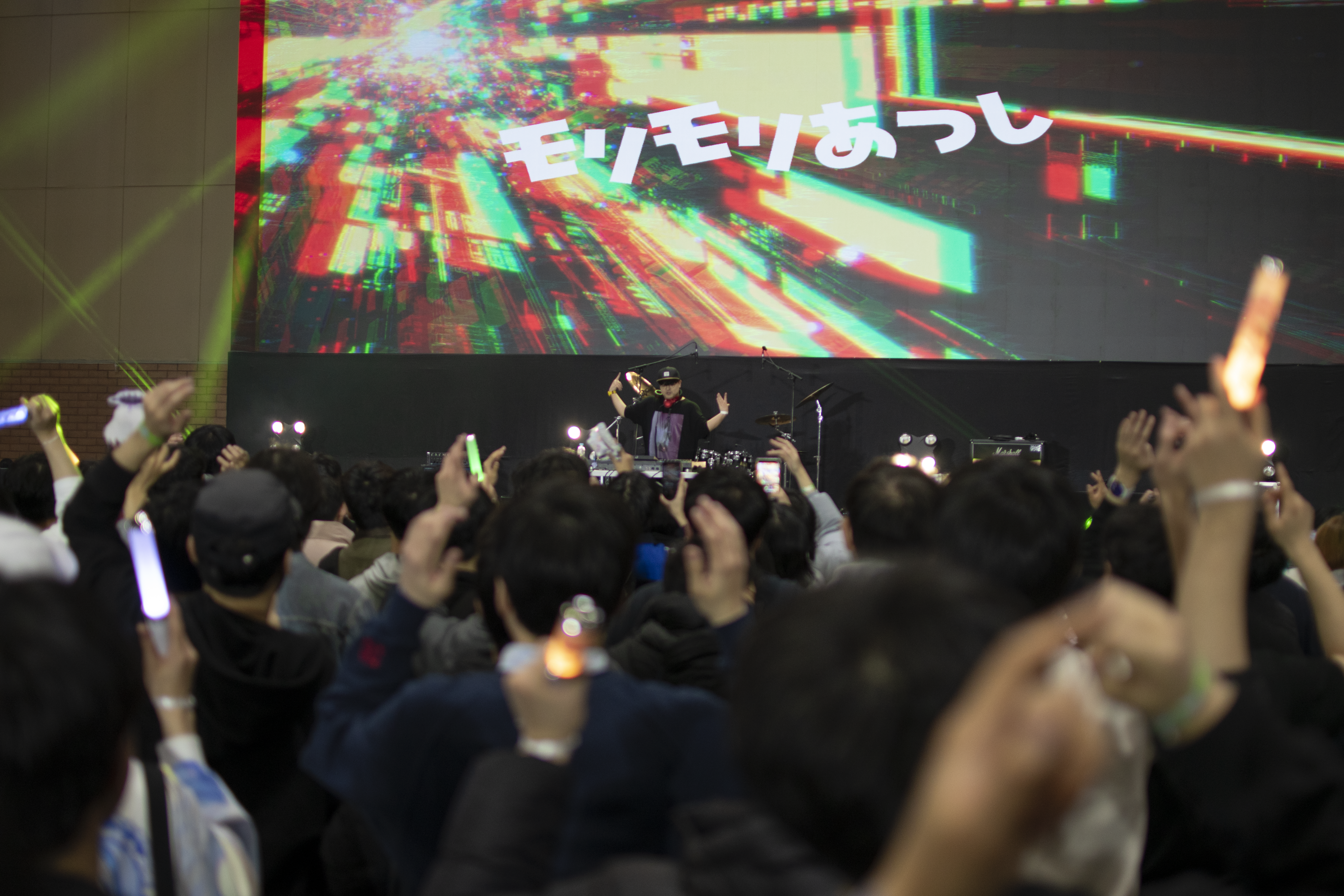 뒤이어 무대에 오른 모리모리아츠시는 ‘Re : End of Dream’, ‘PUPA’, ‘MilK’ 같은 자신의 대표곡에 더해, ‘The Fomula’, ‘Exhaust Hype’, ‘베이스드롭 프릭스’ 등 2010년대 리듬게임을 대표했던 곡들을 믹스셋에 담아 관객들에게 추억과 열정이 뒤섞인 무대를 선사했다. 특히 마지막에는 처음에 선보였던 ‘Re : End of Dream’과 ‘PUPA (GRG Remix)’로 다시 무대를 장식하며 공연 전체에 수미상관을 더해, 관객들의 큰 호응을 이끌어냈다.