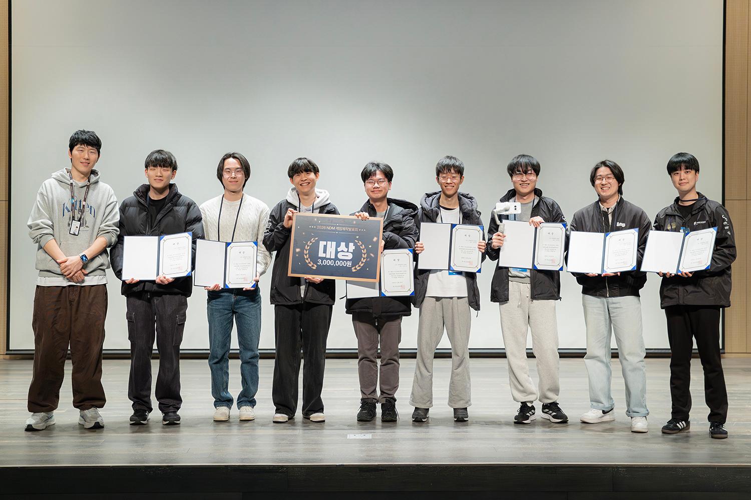 [사진] 2026 NDM 대상 수상 동아리 고려대학교 ‘CAT&DOG'(맨 왼쪽) 시상자 넥슨코리아 최영훈 실장)