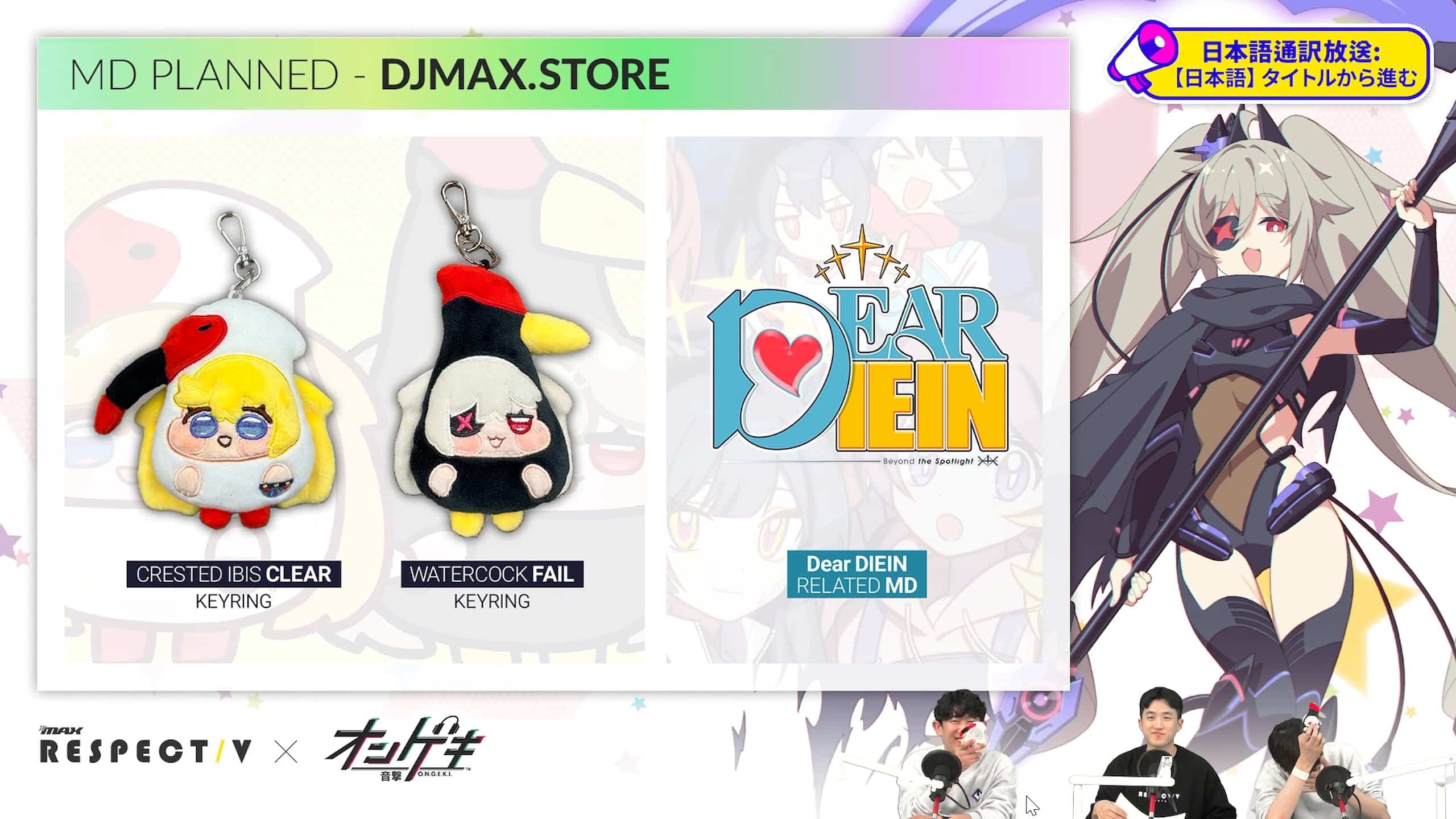 한편 이날 방송에서는 리버티 시리즈의 최종장 ‘V 리버티 5’가 6월 출시 예정이라고 밝혀졌으며, 프리플로우와 협업한 다인 모델의 신작 키보드 ‘PREFLOW Archon M2 PRO MAX’는 장패드와 함께 4월 출시될 예정이다. 판토 작가가 디자인한 ‘흥이 뜸부기/망이 따오기’ 인형 키링과 에어 모드에 수록된 비주얼 노벨 ‘Dear DIEIN : Beyond The Spotlight’ 관련 굿즈도 여름 중 선보일 계획이다. 또한 디제이맥스 리스펙트 V 정식 발매 6주년 기념으로 디제이맥스 온라인 악곡인 ‘River Flow’가 4월중 수록될 예정이다.
